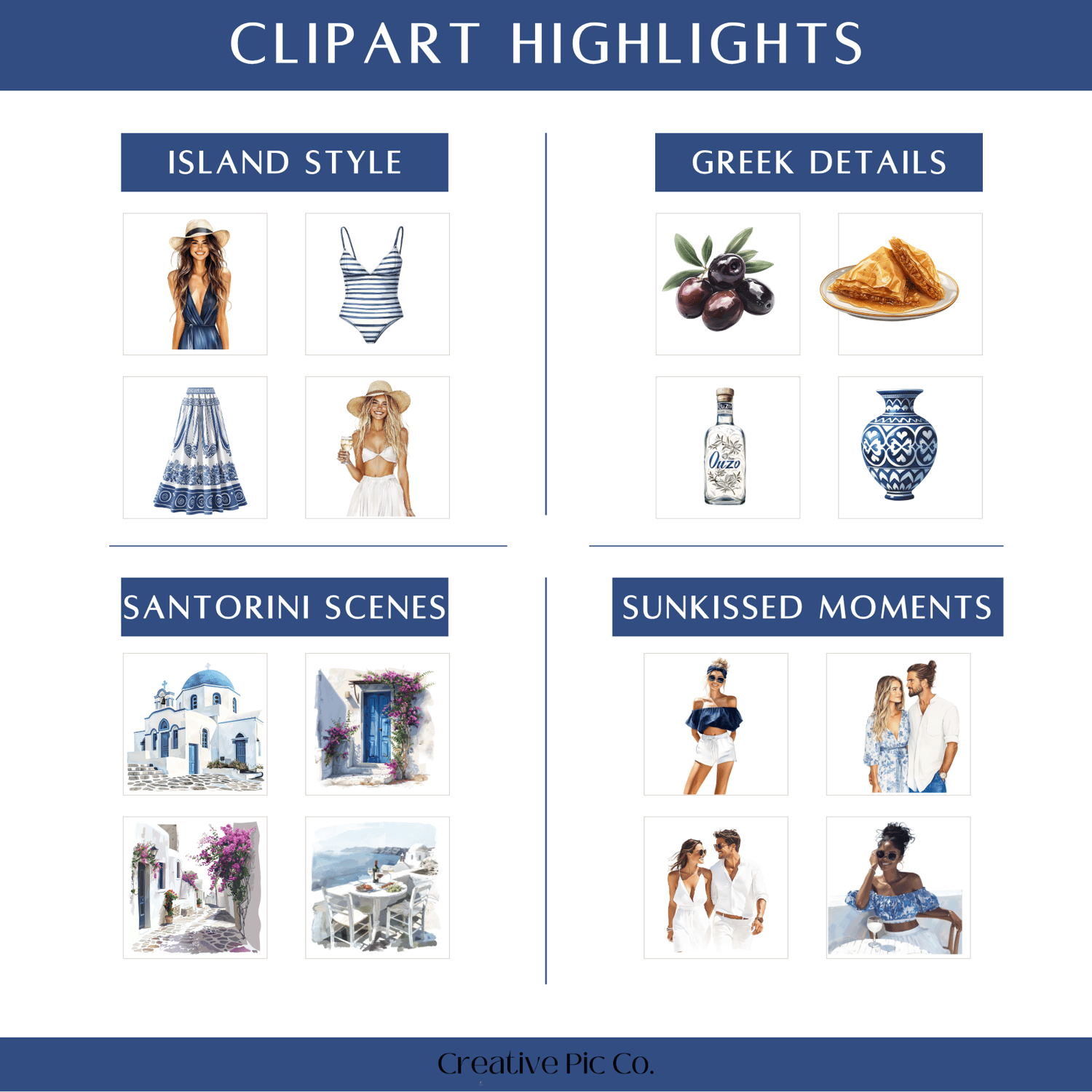 Step into sun-soaked days and breezy coastal beauty with our Santorini Clipart Set, a dreamy blend of Mediterranean architecture, stylish island outfits, fresh food, and serene scenes. This collection brings together everything you need to capture that iconic Greek charm, from whitewashed villas and bougainvillea to chic summer fashion and scenic backdrops. Perfect for planners, digital scrapbooking, branding, or any design that calls for a soft, elegant vacation vibe.