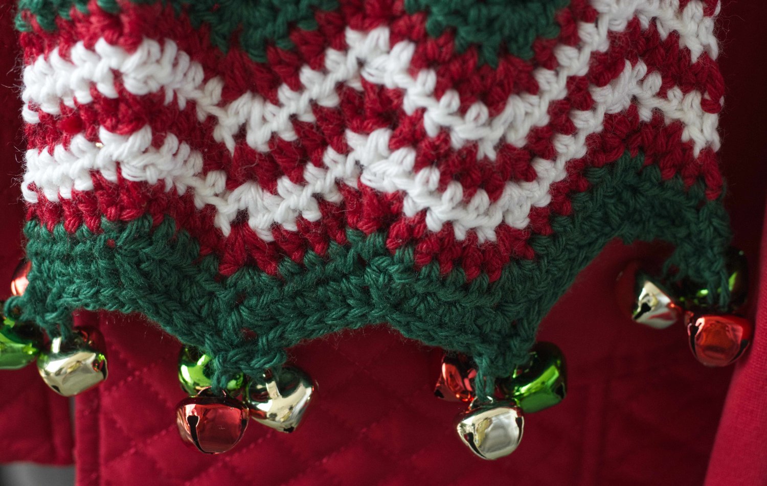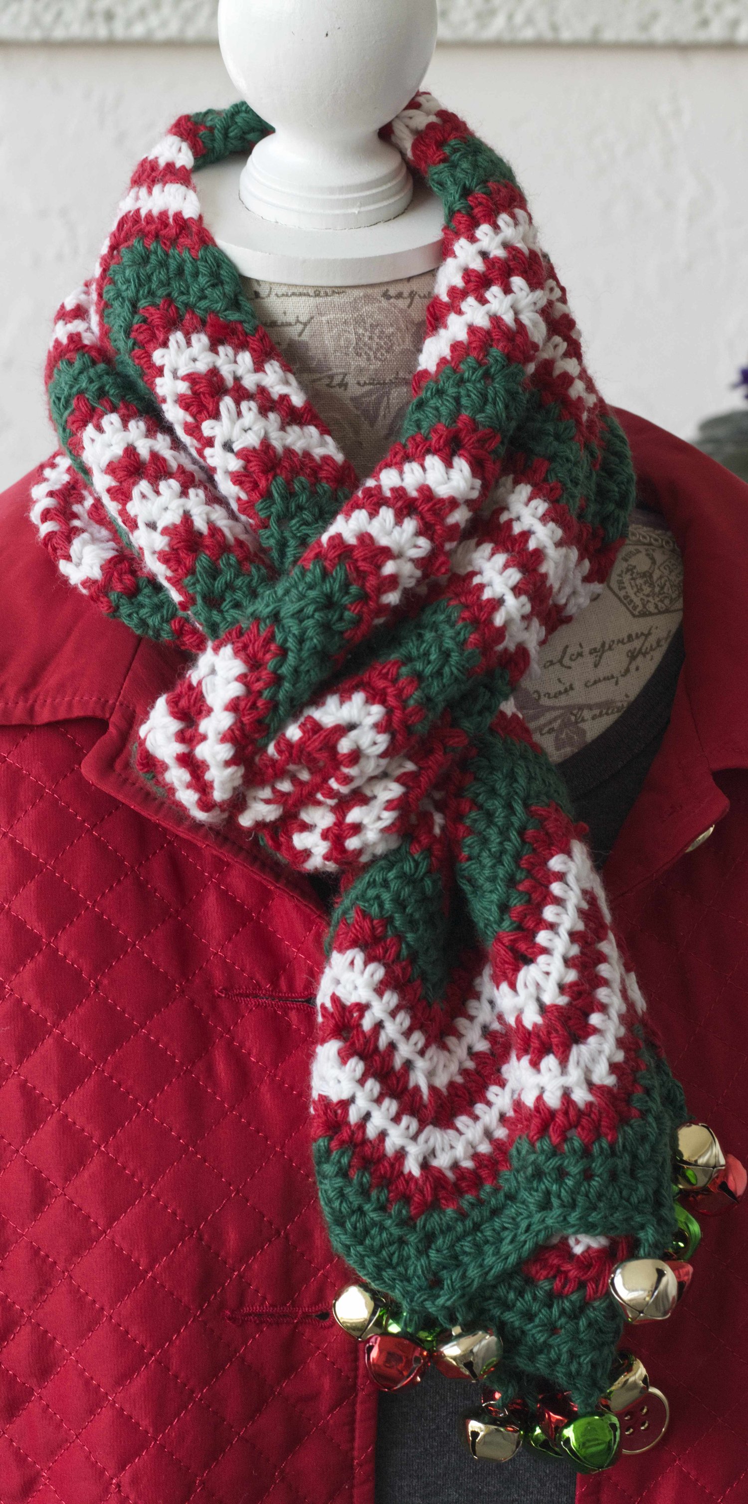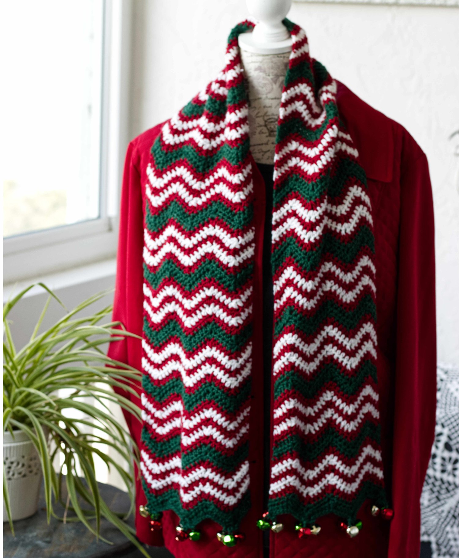 The Merry Scarf will catch everyone’s eye when you arrive, and they will hear you too. There is a playful jingle bell edging. The chevron stitch adds dimension and colors, using three common holiday colors. You can make another in your favorite colors or team colors.