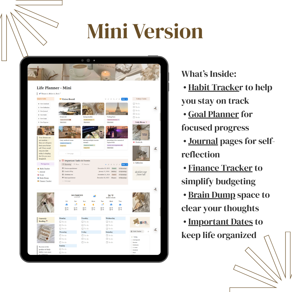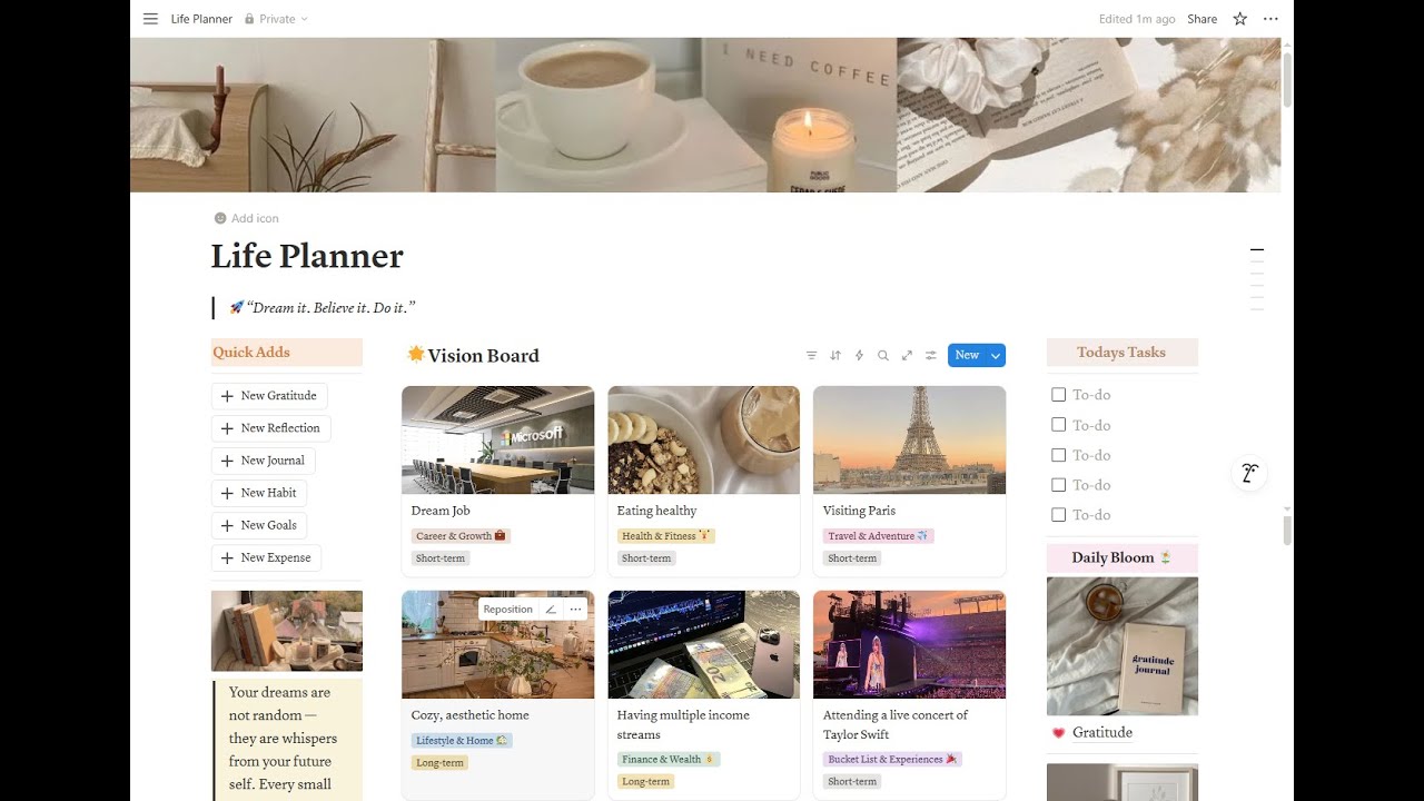 This all-in-one π Notion template is designed to bring structure π, clarity πΏ, and inspiration π‘ into your daily life. It blends productivity β‘ with wellness π so you can stay balanced while achieving your dreams.