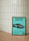 This poster captures the striking design and record-breaking speed of the Agera RS, showcasing its aerodynamic lines and powerful presence.