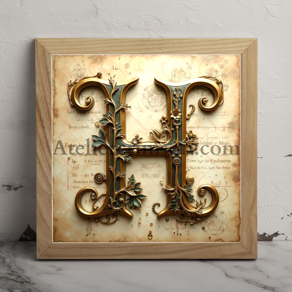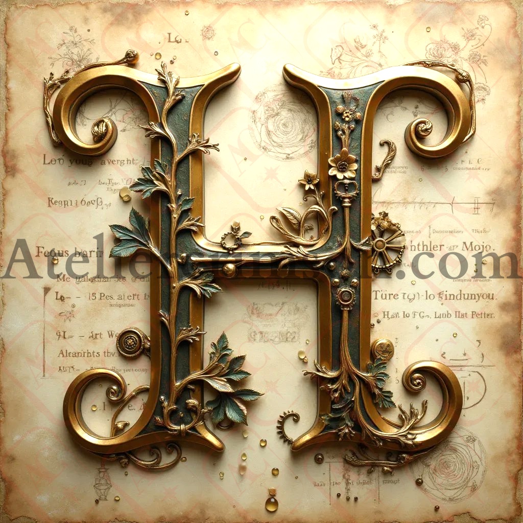 The letter H Art Nouveau alchemical Each character crafted as a stunning 3D brass sculpture with weathered patina, set against a mystical alchemical parchment. Ornate vines, floating bubbles, and antique gears create a magical shabby chic atmosphere. Perfect for vintage-inspired designs, book covers, or unique wall art."