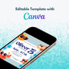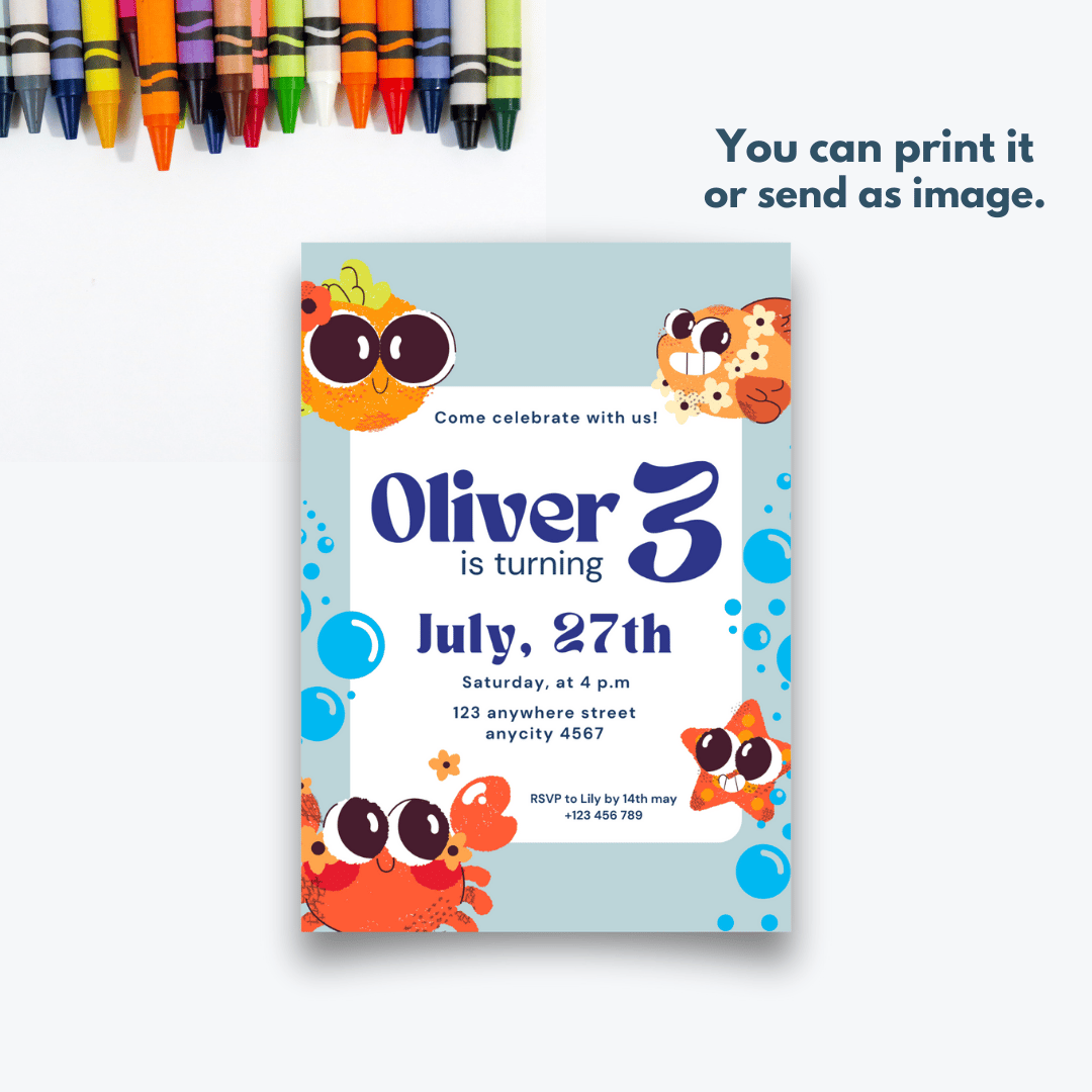 Featuring a fun underwater summer theme with cute sea creatures and bright colors, this editable Canva template is perfect for any summer birthday party.