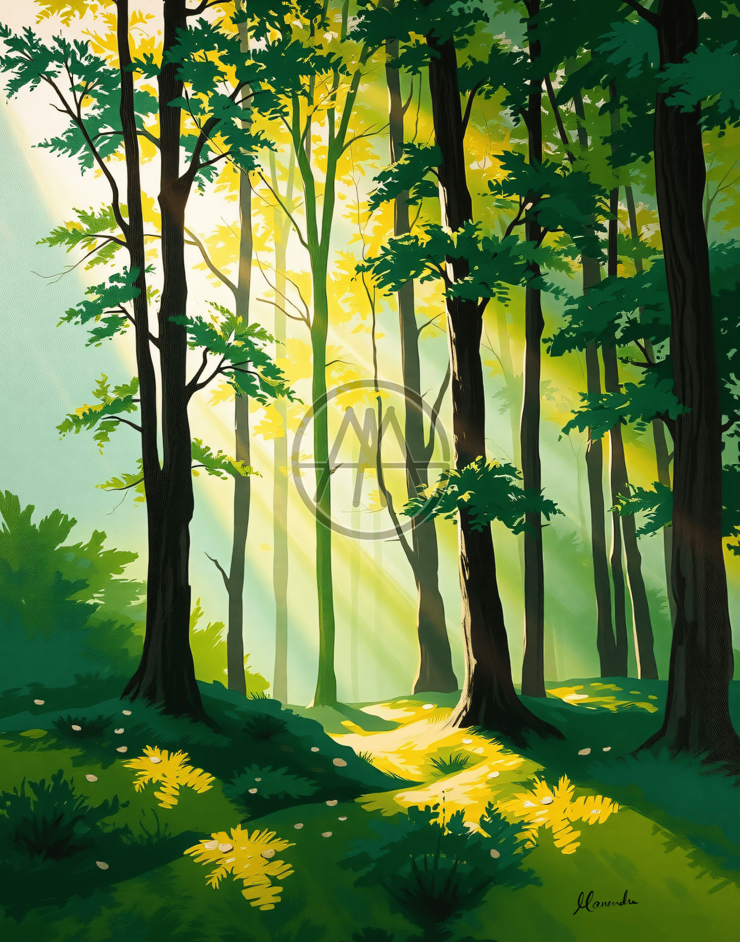Each detail — the soft greens, golden rays, and layered shadows — mirrors nature’s whisper of calm. Inspired by early morning light filtering through a peaceful forest, this piece invites you to pause, breathe, and reconnect with serenity.
