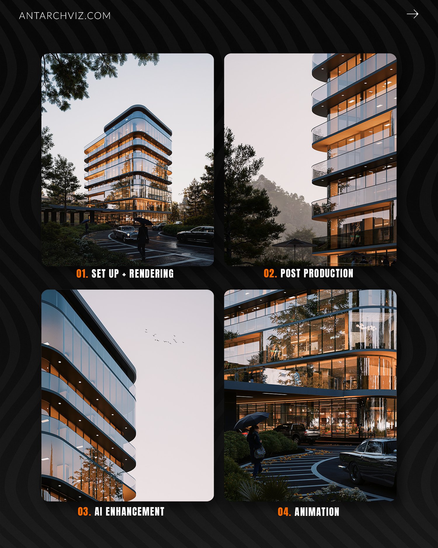 Scene Setup β Rendering β Post-production β AI Enhancement β Animation
