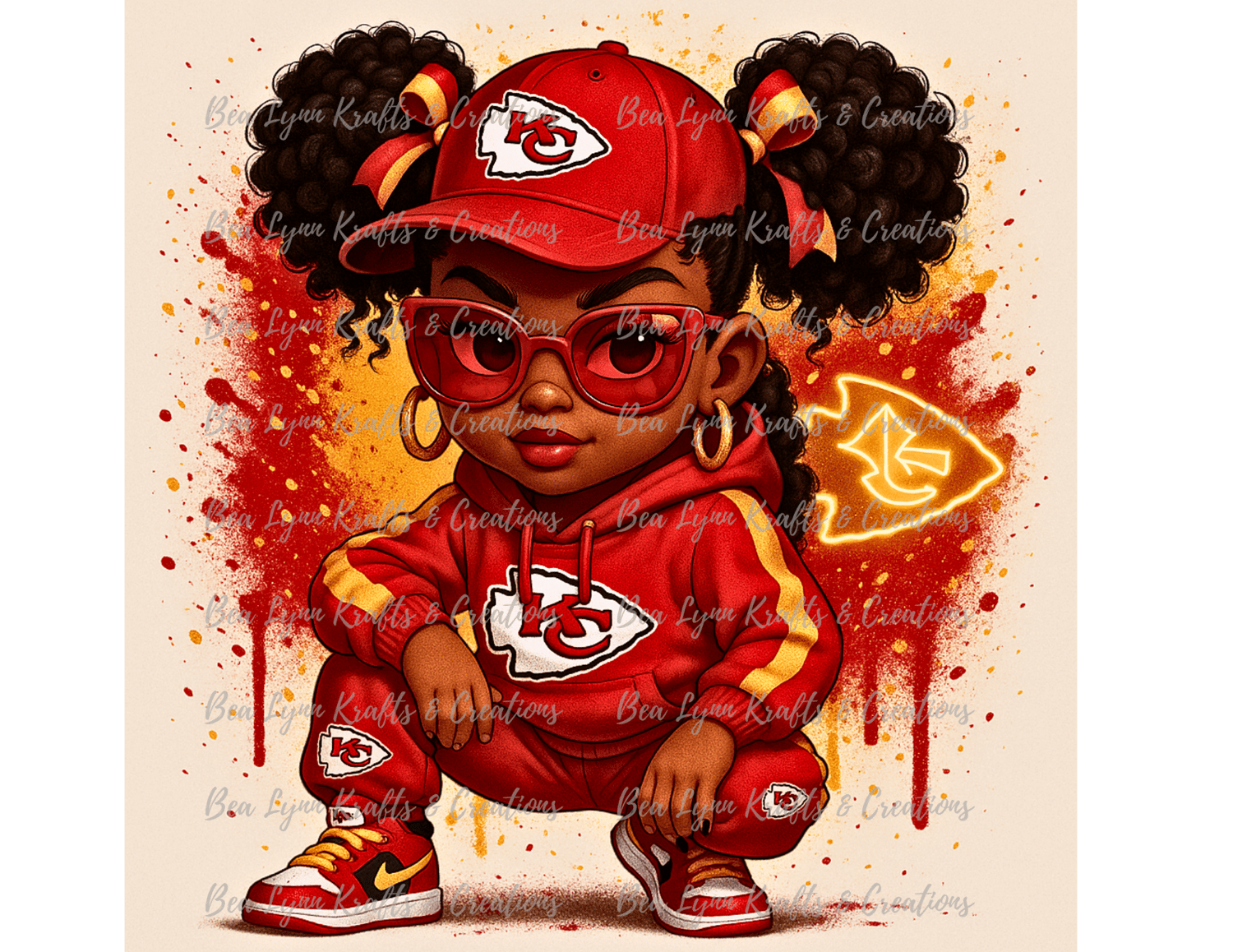 Bring the ultimate Kansas City energy to your creations with this high-quality transparent PNG featuring a confident little girl rocking her red-and-gold Chiefs tracksuit with bold style, gold hoop earrings, and oversized shades! Perfect for die-hard fans and creators who want to add a touch of personality and team pride to their designs.