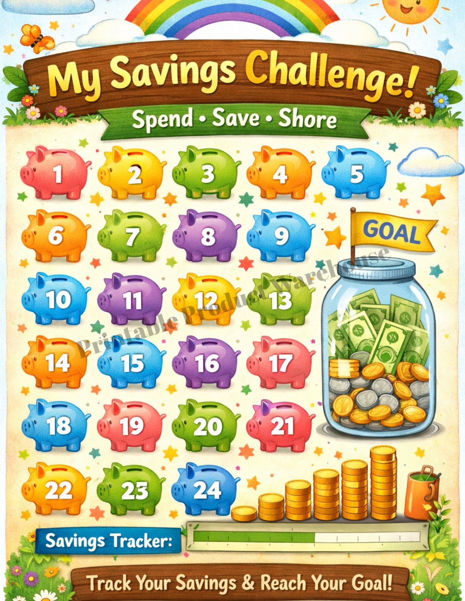 This printable savings challenge helps children set goals, track progress, and stay motivated while building strong money habits.