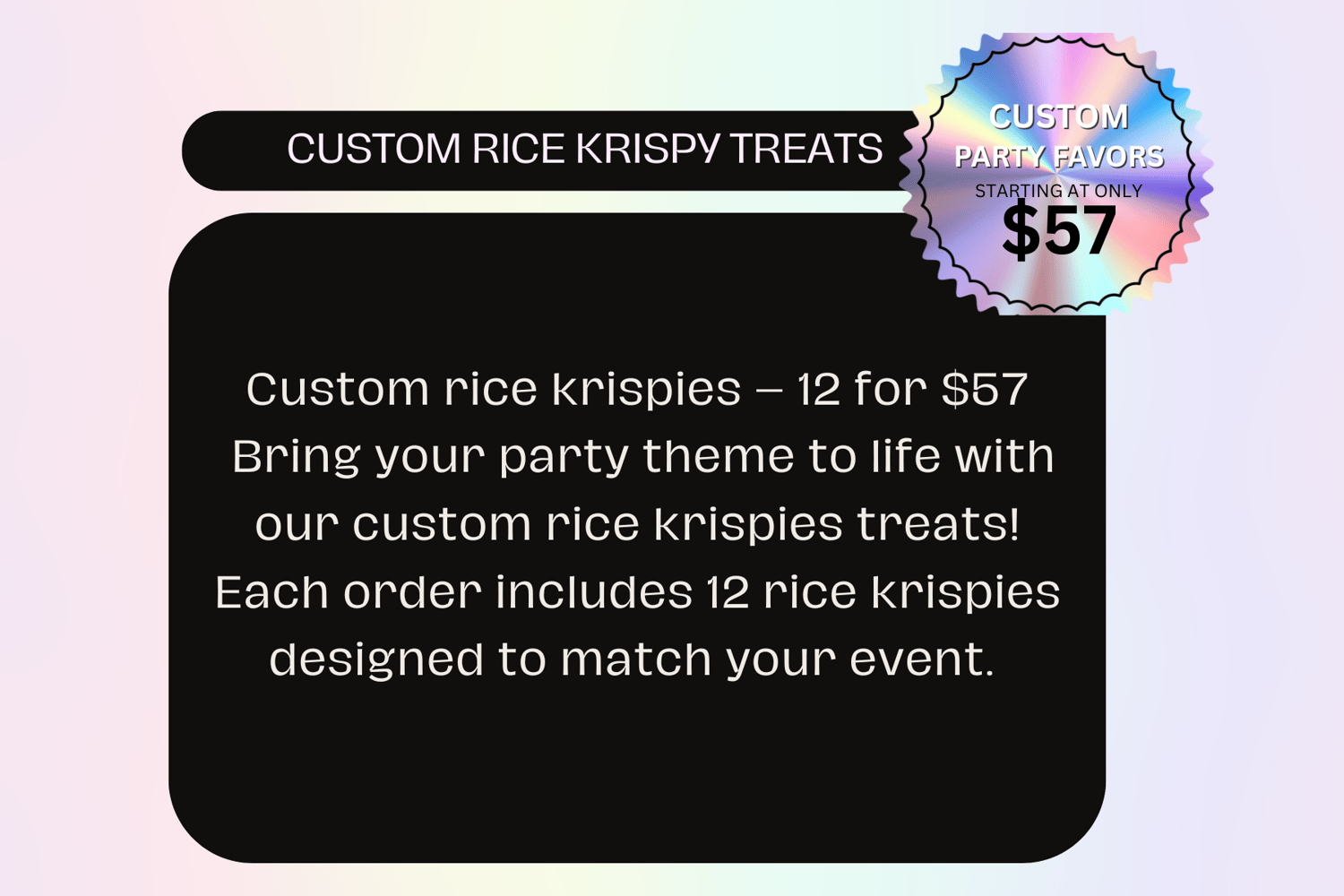 Add the perfect touch of glam to your event with our custom-designed rice krispies treats! Each order includes Custom Rice Krispies Treats – Set of 12 ($57), created to match your theme and make your party unforgettable. See the magic for yourself! Party Favor Magic