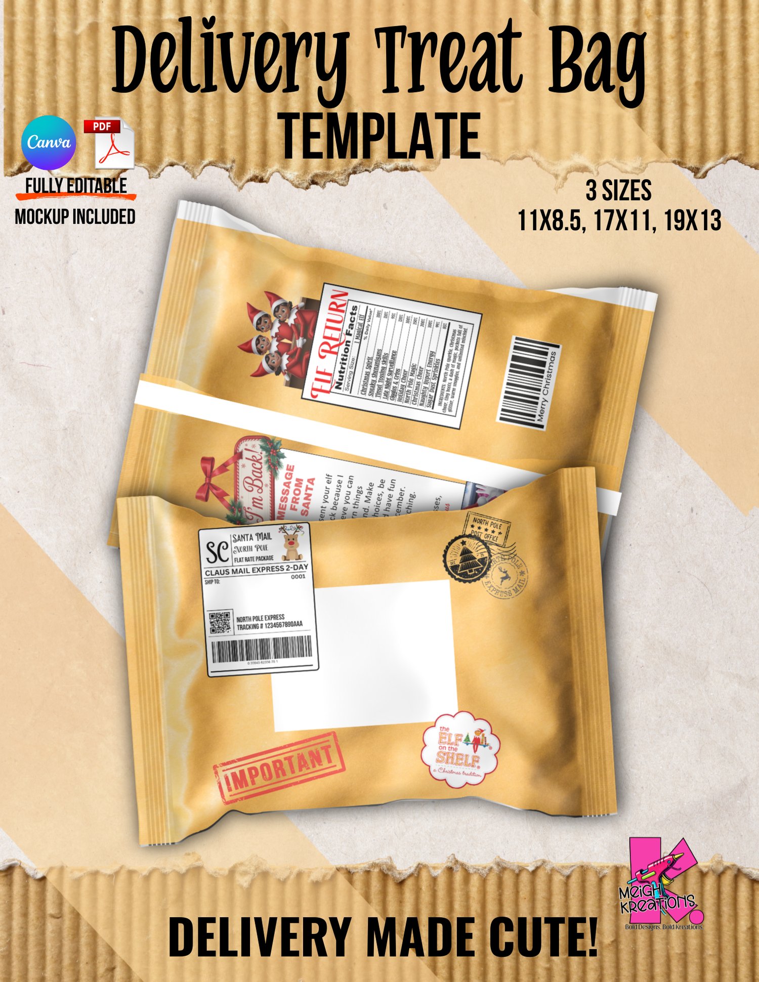 Turn your treats into the cutest holiday delivery with this fun mail themed treat bag template. Designed to look like a festive North Pole package this template adds instant magic to your Elf themed crafts Santa deliveries holiday gifts customer orders and more.