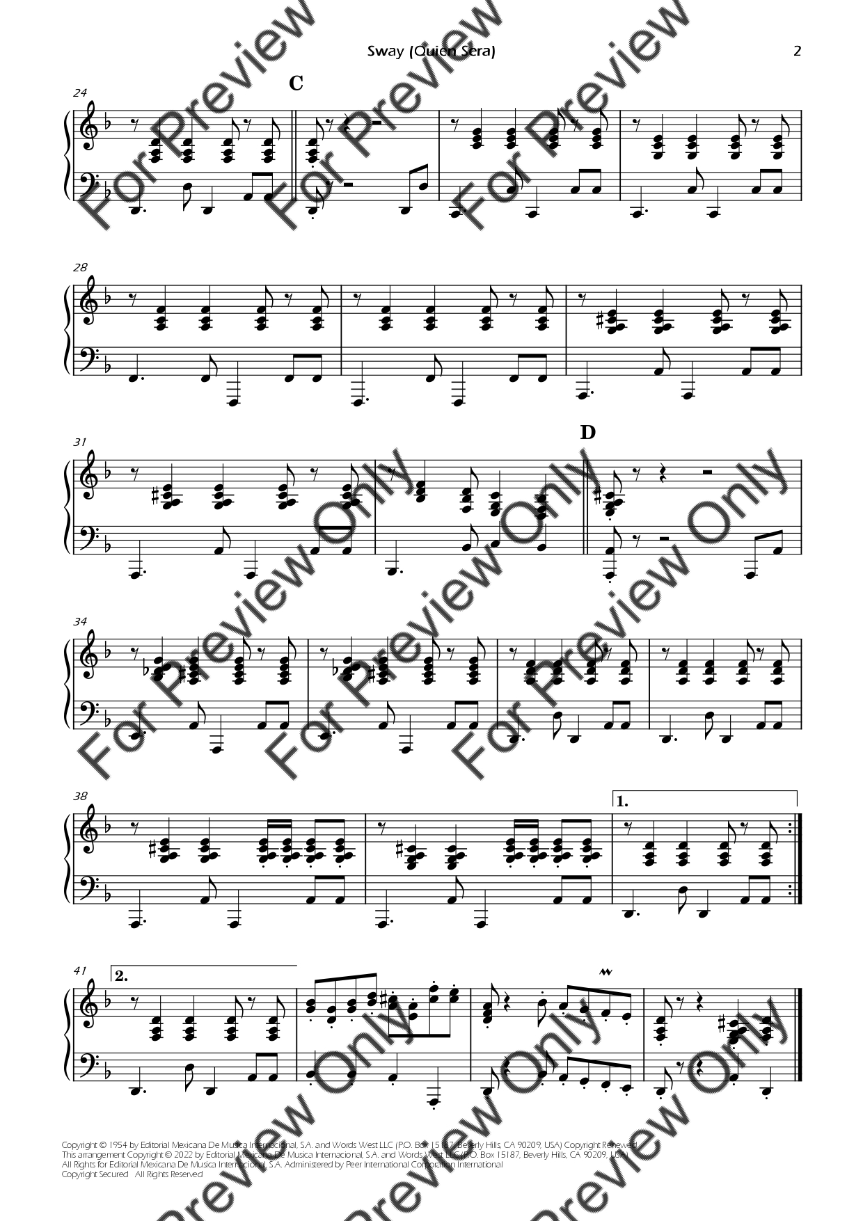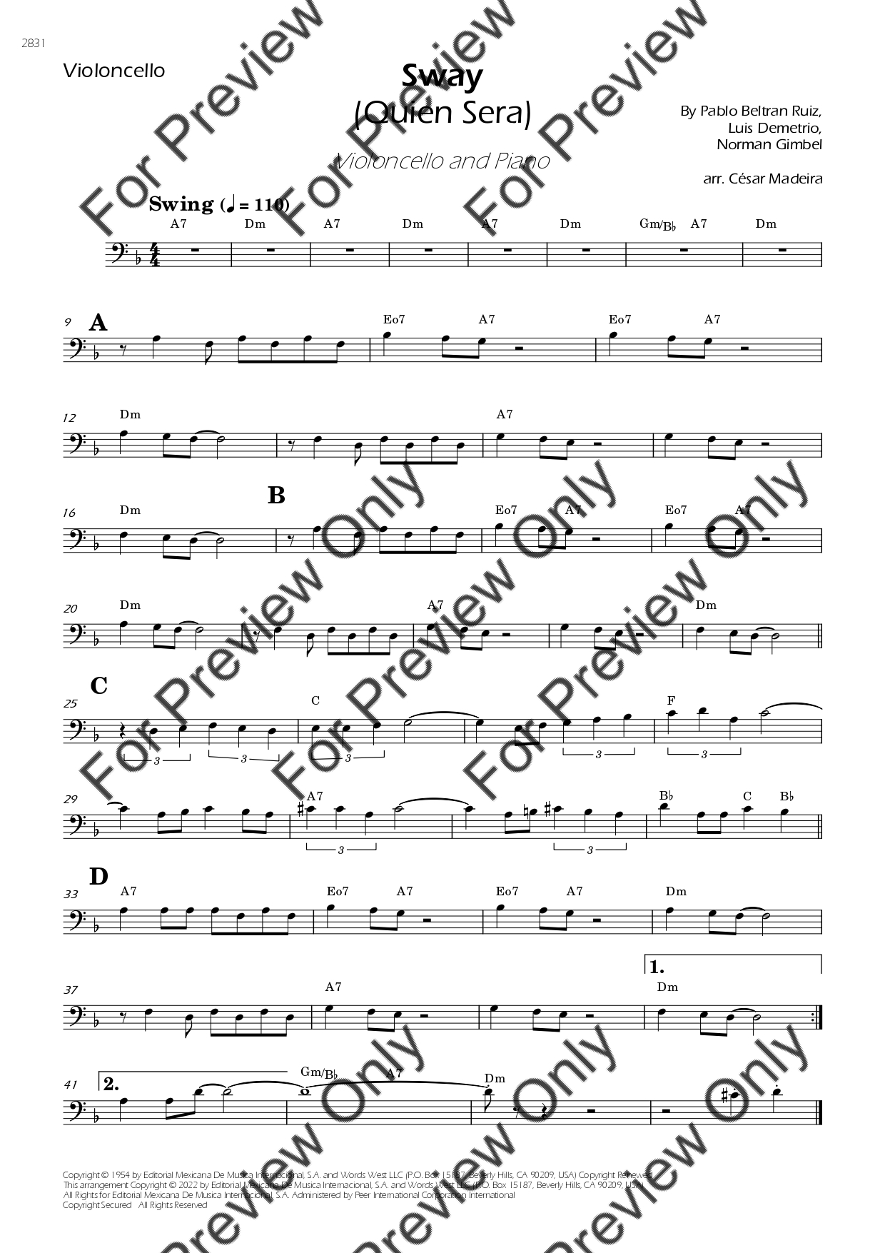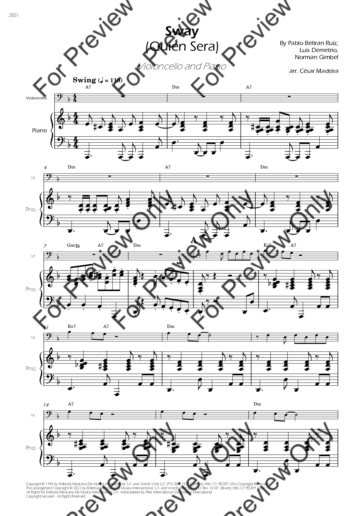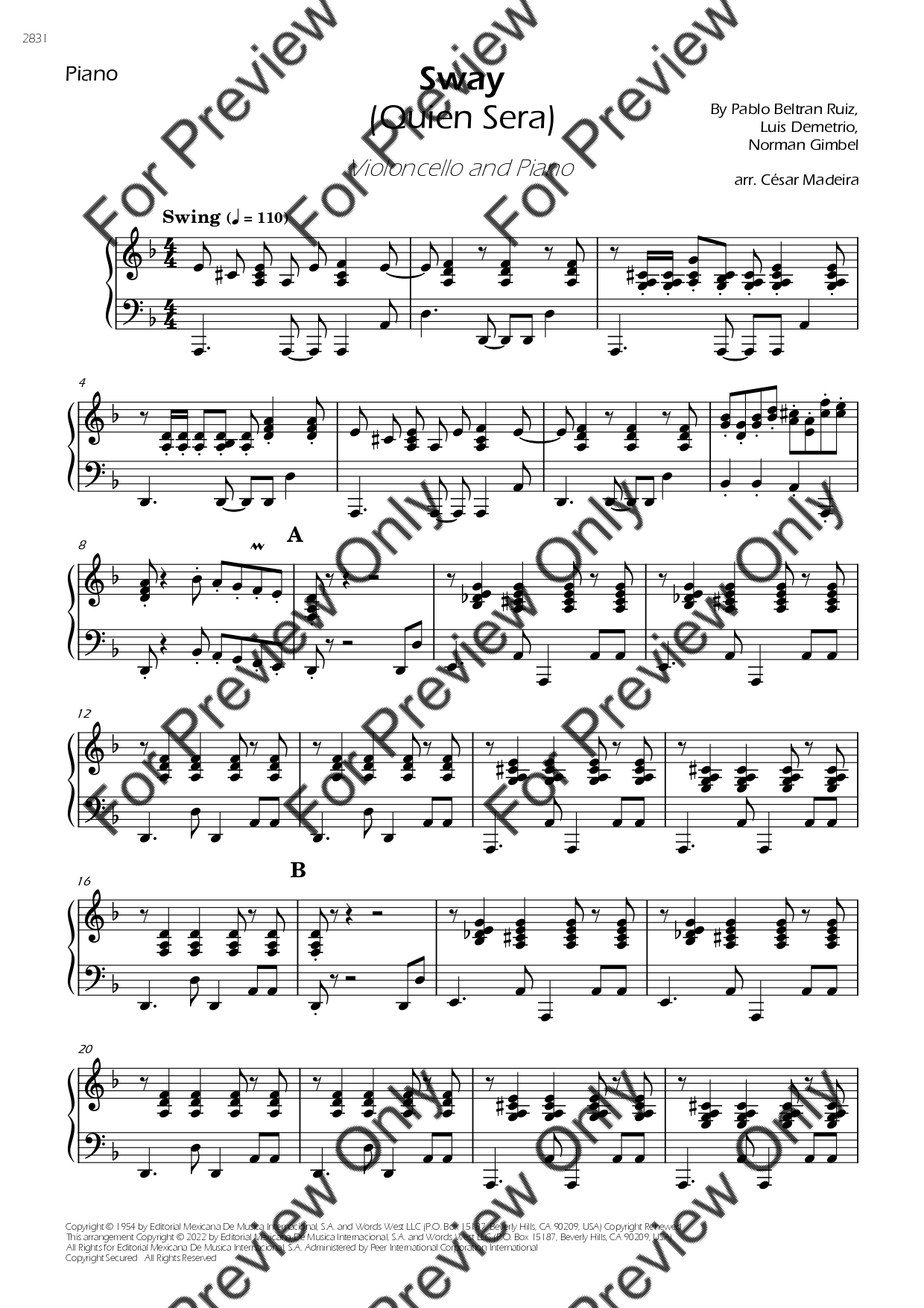 Sway (Quien Sera) by Dean Martin. Arrangement for Violoncello and Piano. With Full Score and Individual Parts. Have fun!