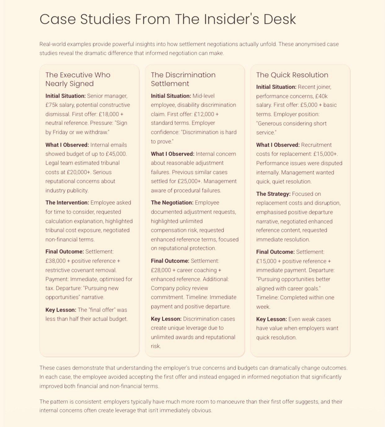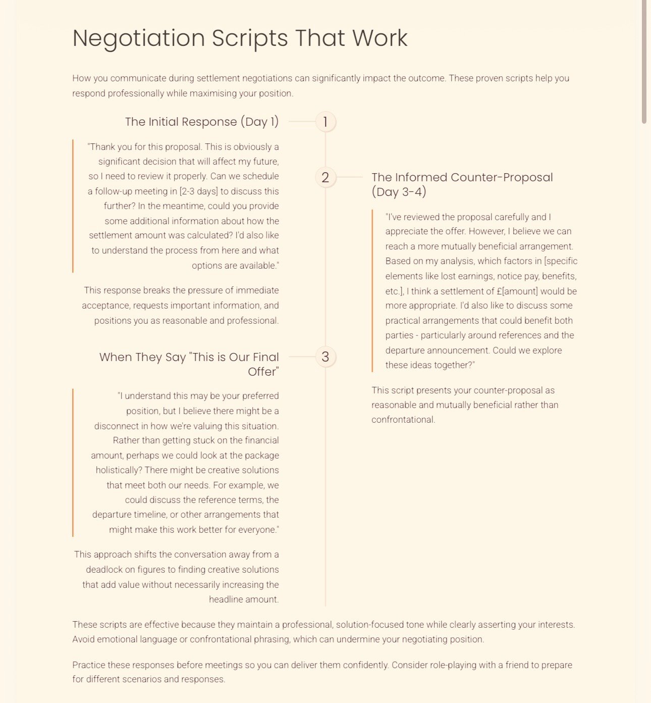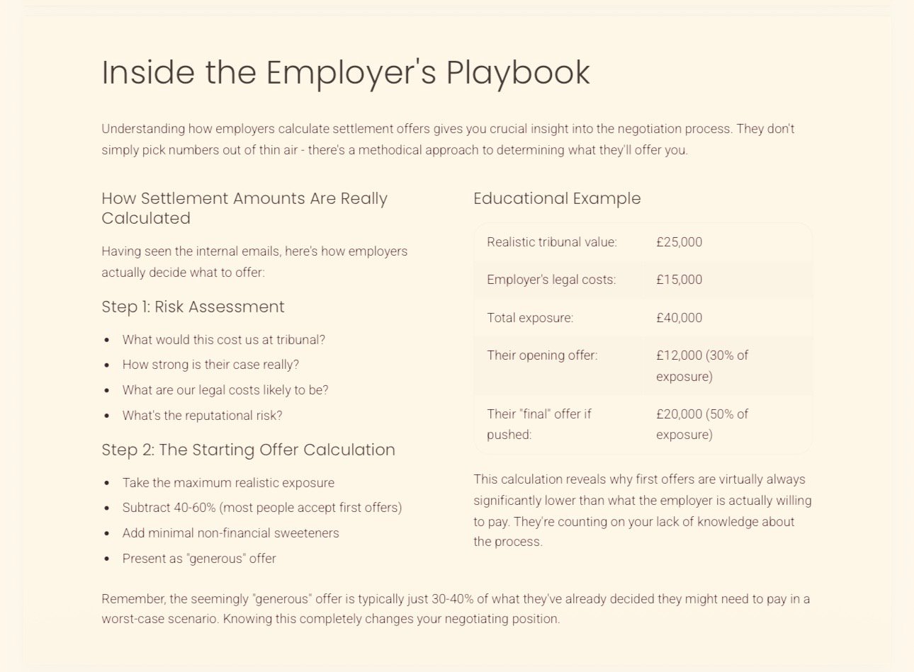 You'll understand how employers actually calculate settlement offers - and where the hidden budget sits. You'll know exactly what to say in the first meeting to buy yourself time instead of crumbling under pressure. You'll recognise the tactics they use to rush you into signing - artificial deadlines, "final offer" bluffs, controlled information. And you'll have the counter-proposal scripts to negotiate from a position of knowledge, not panic.