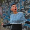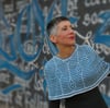 Interferenze è una mantellina a righe caratterizzata da un gioco di rombi ottenuti con la tecnica dei punti passati (detta anche mosaico) che permette di creare disegni colorati usando solo un filo alla volta.