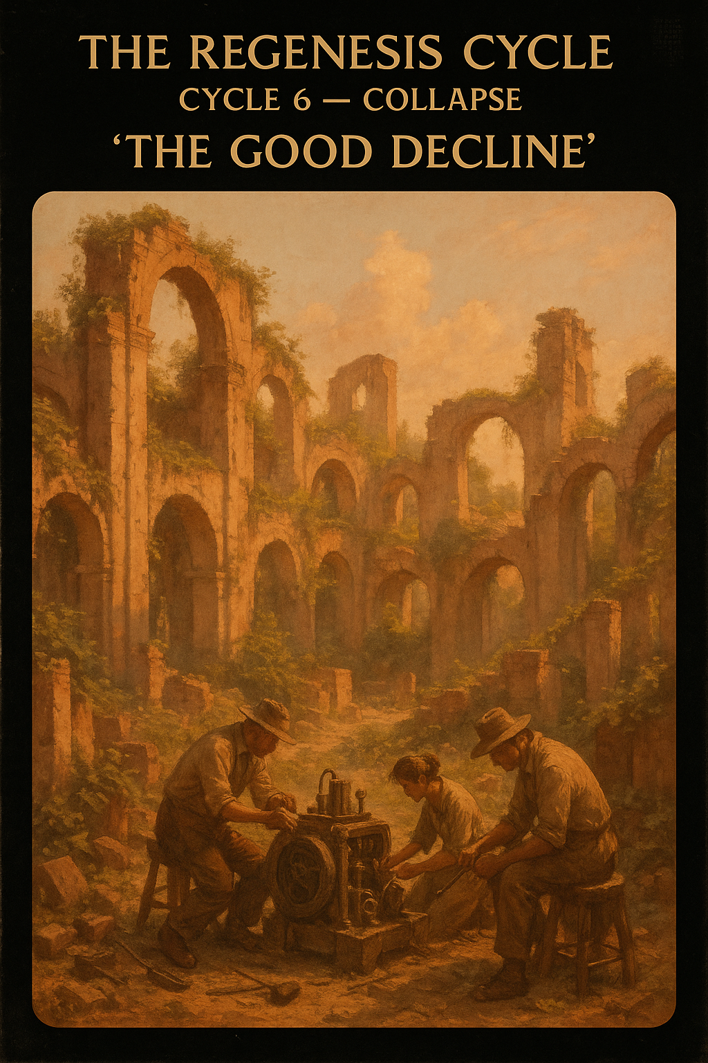 Entropy becomes a moral philosophy. In post-industrial Tuscany, civilization stops producing and starts repairing—peace found in the refusal to progress.
