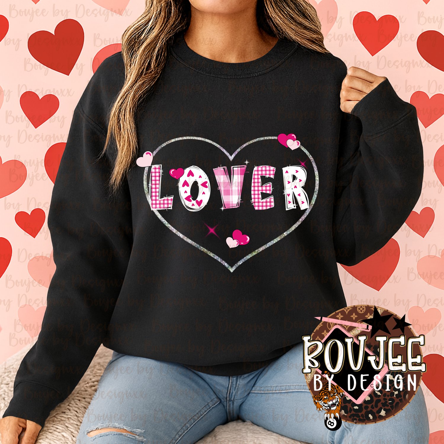 This Valentine LOVER design features a sparkly heart outline with pink patchwork letters and playful heart accents. Simple, trendy, and perfect for creating Valentine shirts, sweatshirts, and cozy love-themed apparel.