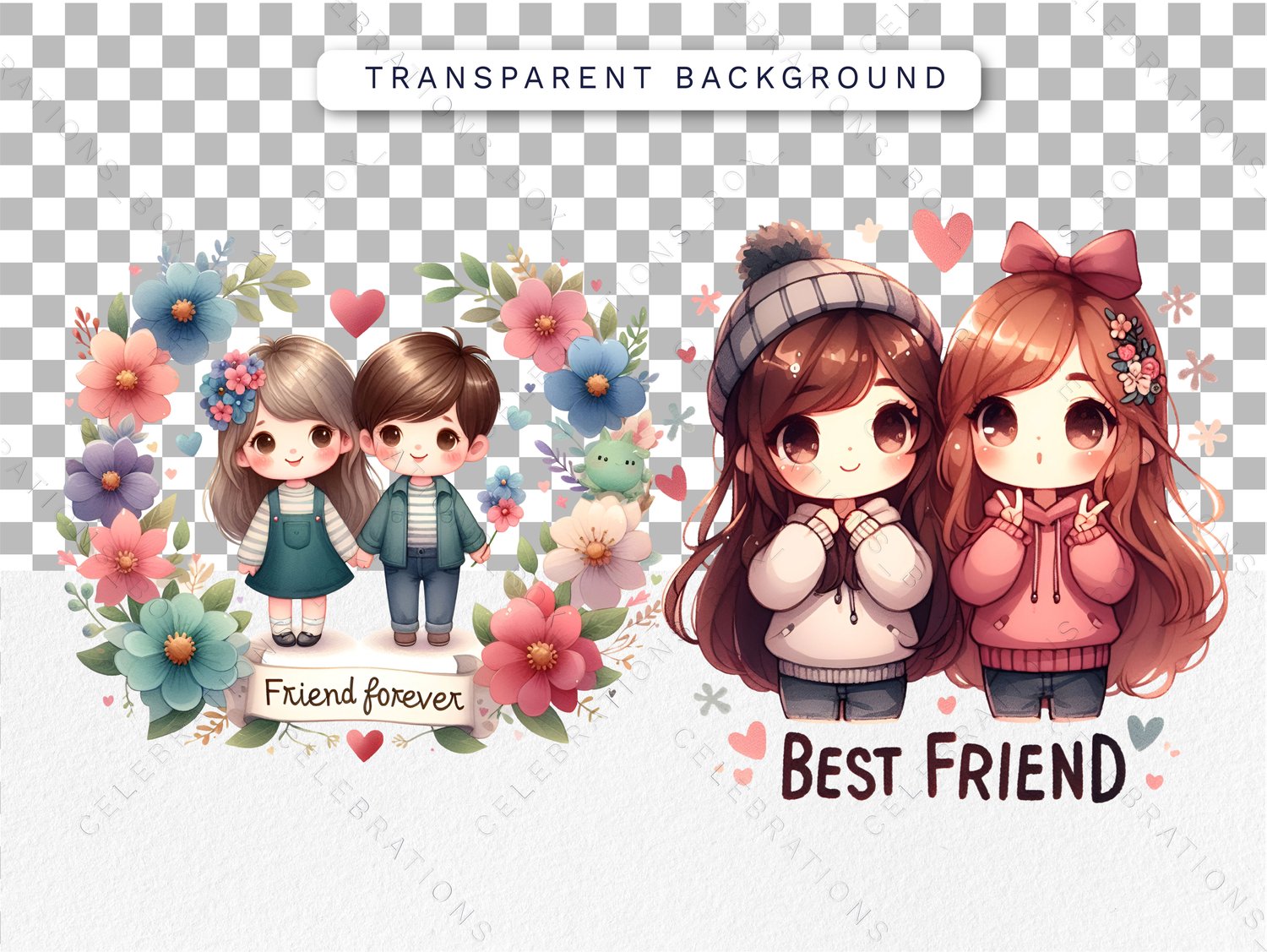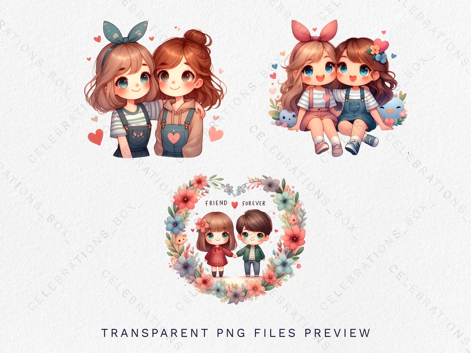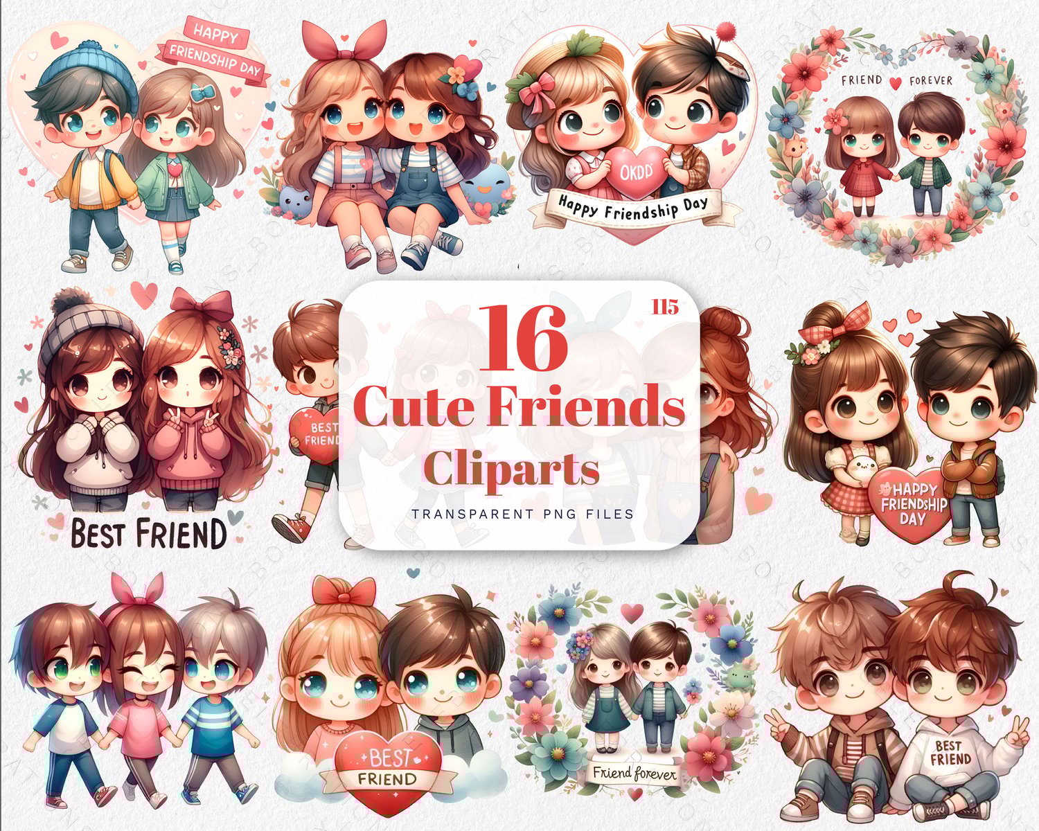 Celebrate the unbreakable bond of friendship with our Watercolor Cute Friends Clipart collection. Highlighting 16 touching Best Friends designs, these illustrations capture the essence of true companionship and the myriad special moments that Friends Forever share. Ready to enhance your projects with the beauty and emotion of enduring friendship!