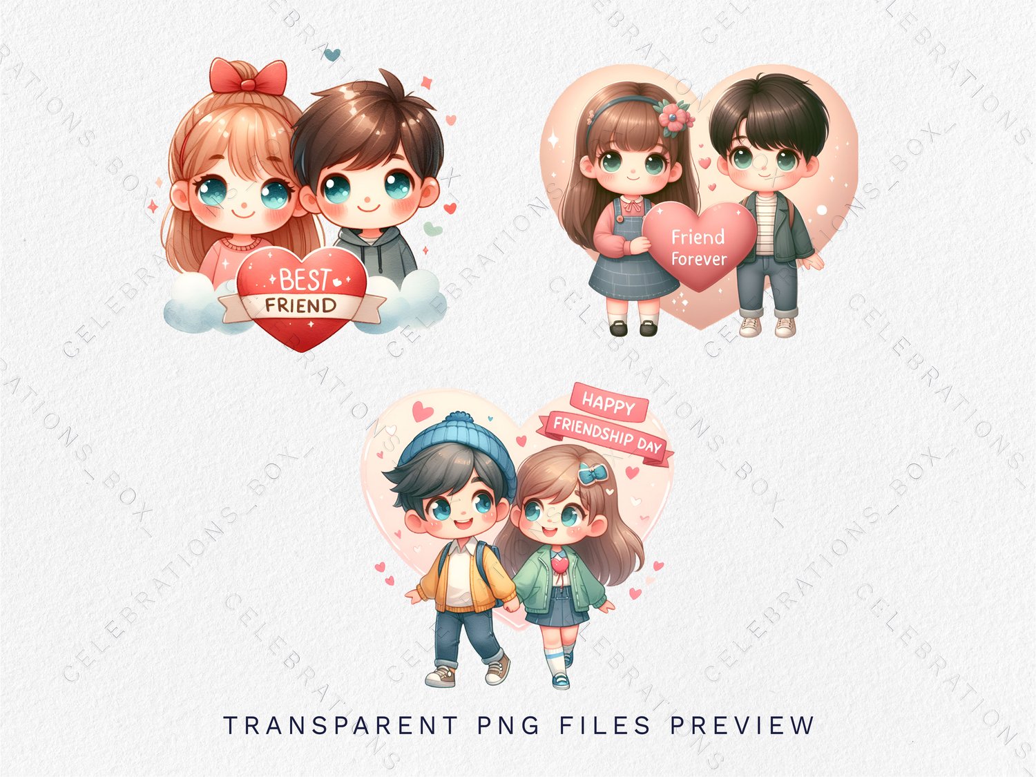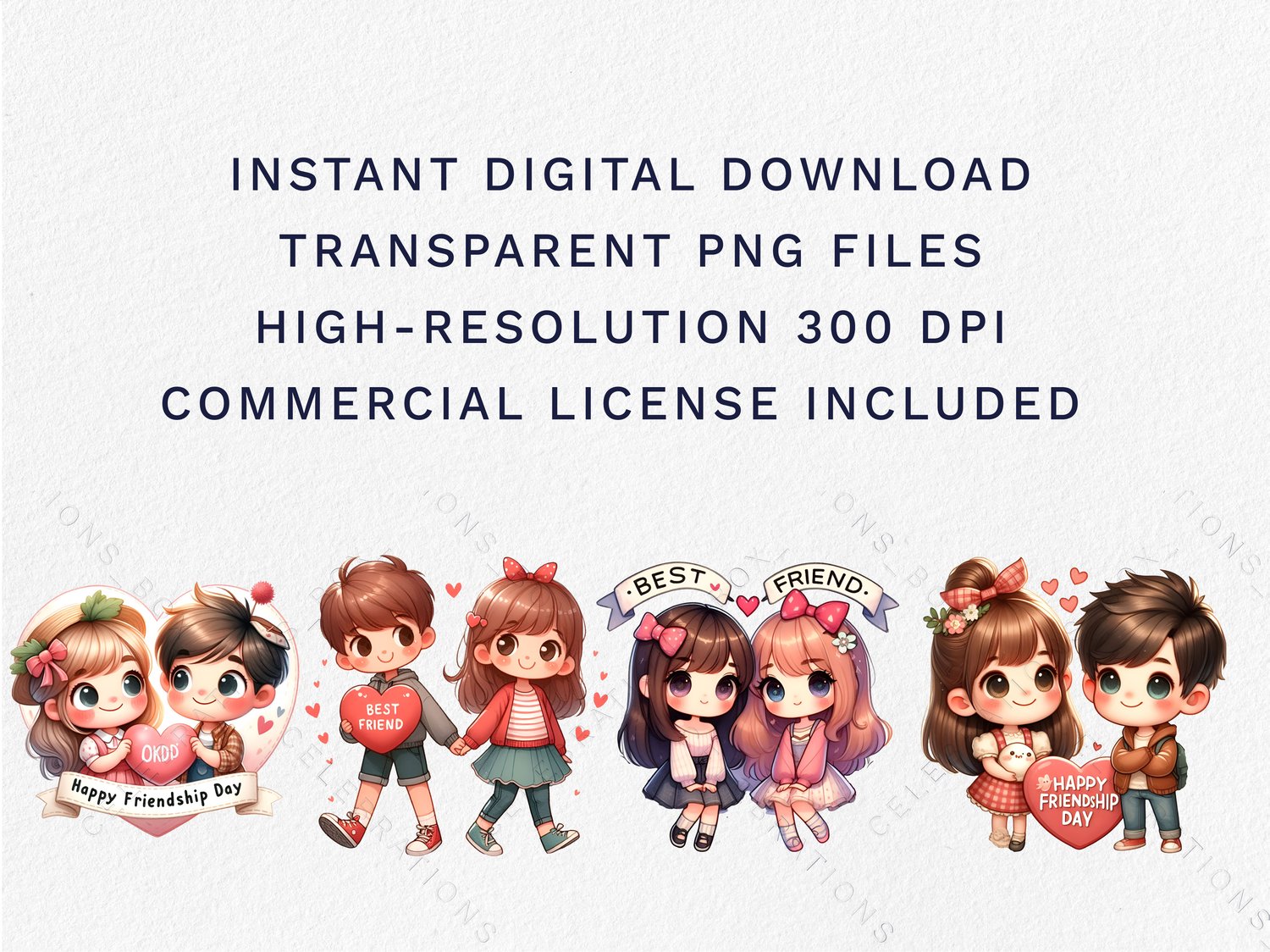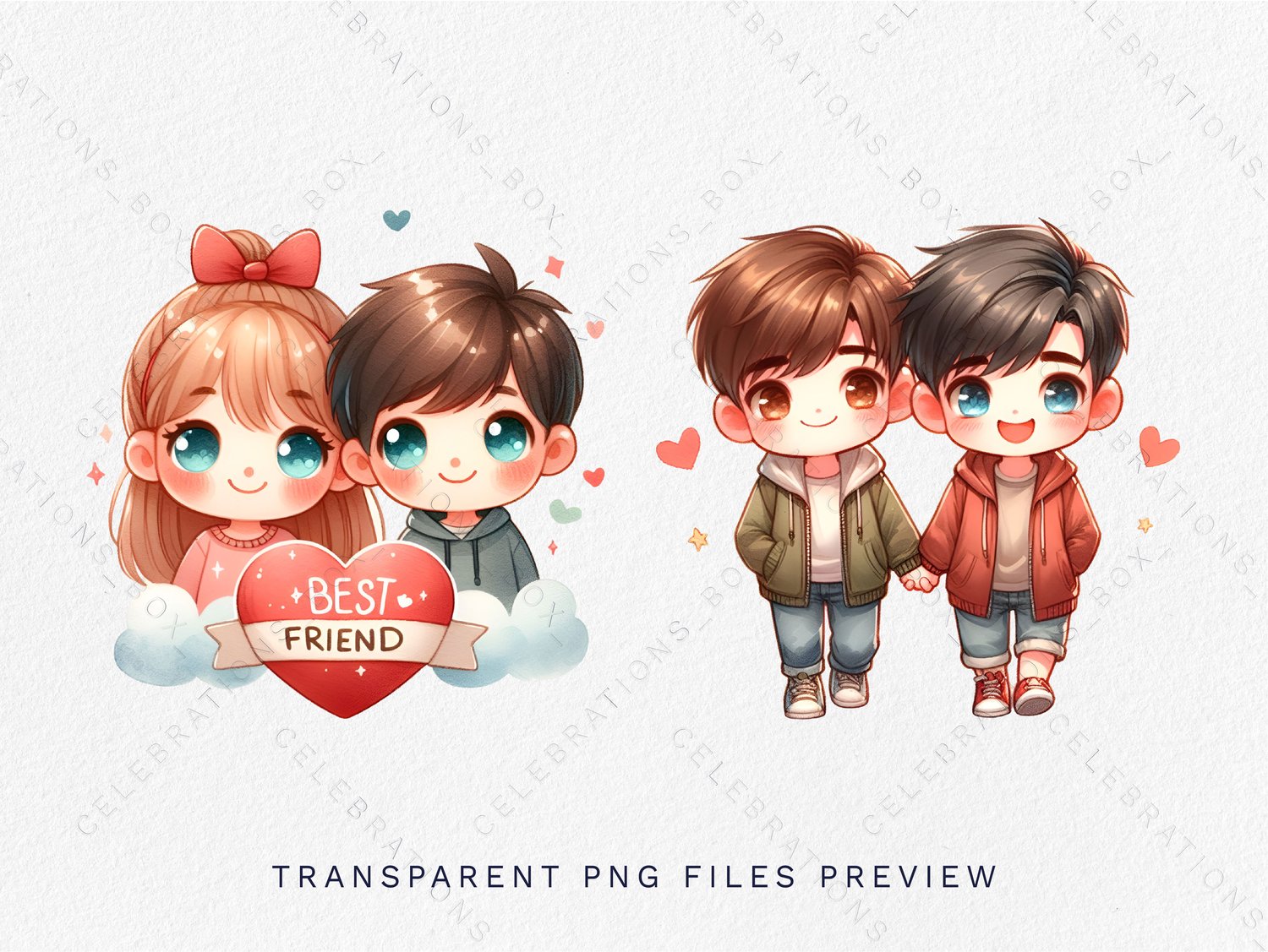 Celebrate the unbreakable bond of friendship with our Watercolor Cute Friends Clipart collection. Highlighting 16 touching Best Friends designs, these illustrations capture the essence of true companionship and the myriad special moments that Friends Forever share. Ready to enhance your projects with the beauty and emotion of enduring friendship!
