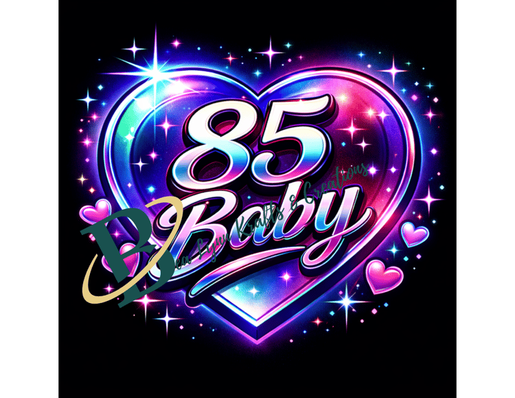 Celebrate the iconic 1985 era with this bold “85 Baby” retro neon design! Inspired by classic 80s culture, this vibrant artwork features chrome lettering surrounded by nostalgic items like cassette tapes, arcade machines, boomboxes, early gaming consoles, and neon sunglasses. The glowing colors of electric blue, hot pink, and purple capture the unforgettable 80s synthwave and arcade vibe.
