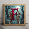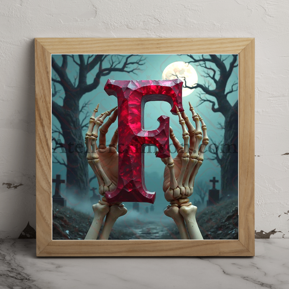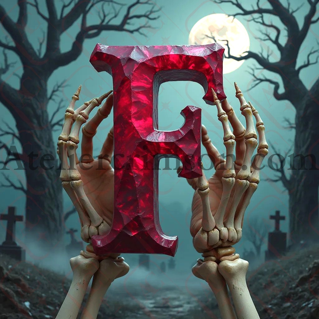 The letter F ruby halloween skull Discover our eerie alphabet series featuring photorealistic ruby letters and numbers. Each character, crafted from deep red gemstone, floats mysteriously in a misty graveyard. Skeletal hands frame these gleaming symbols against a moonlit, Halloween-inspired backdrop. Perfect for gothic design projects or seasonal decor inspiration!
