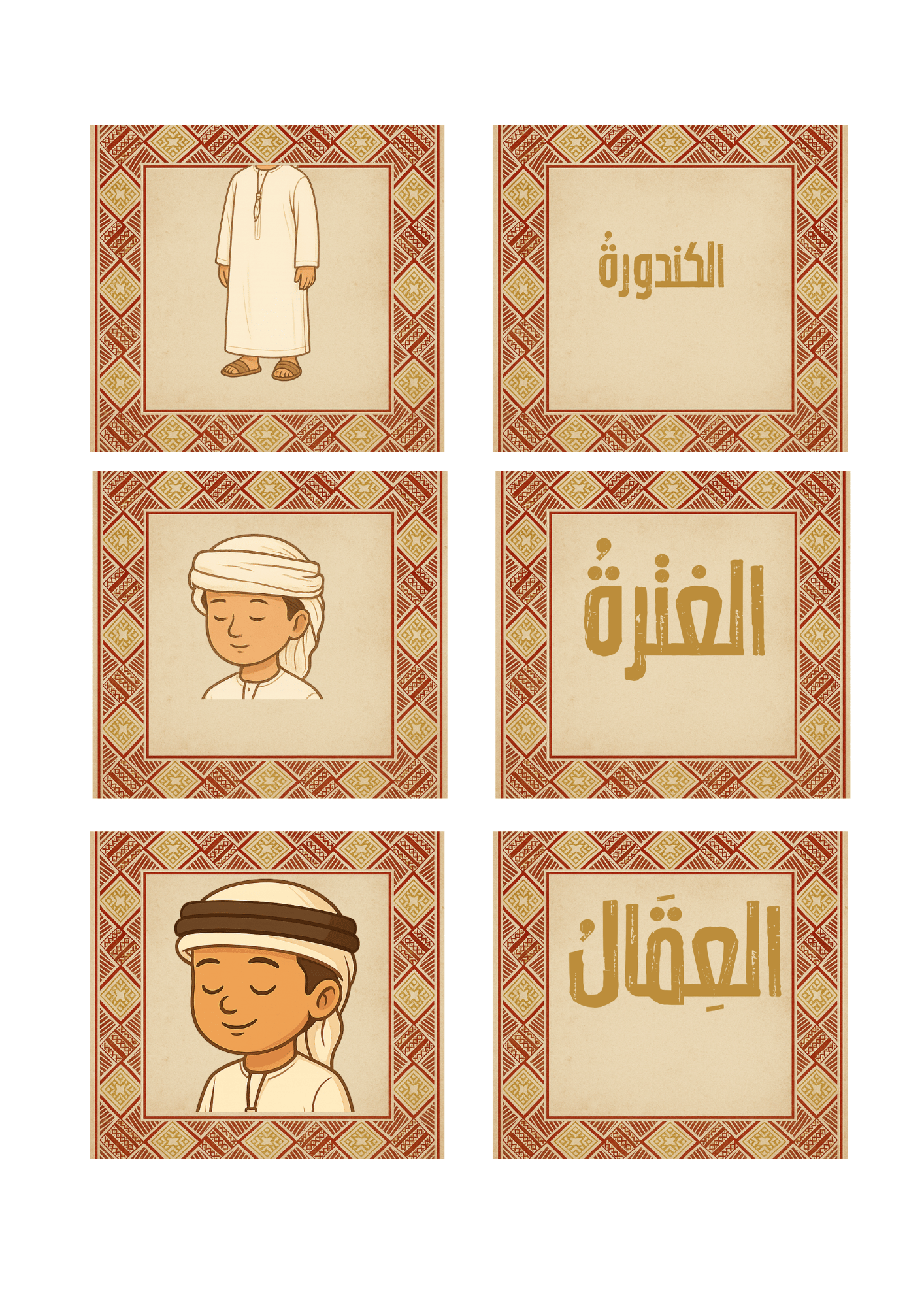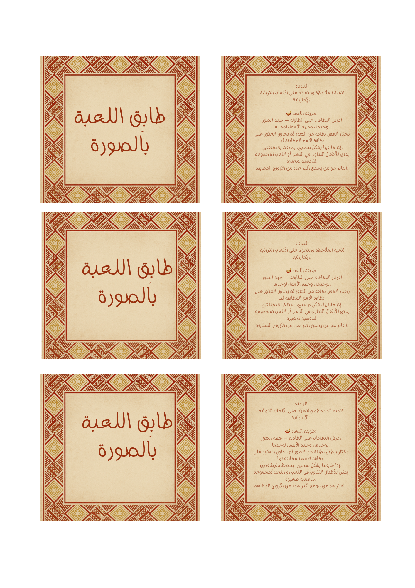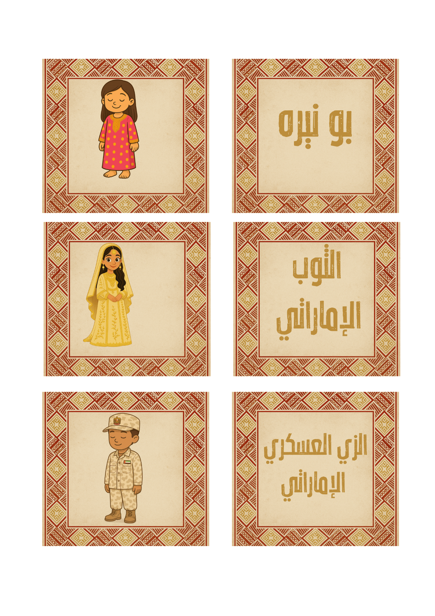 يطابق الأطفال بين الصور أو بين الصورة واسم اللعبة ليتعرّفوا على ألعاب الإمارات القديمة بطريقة شيقة تنمّي التركيز والذاكرة. 🌾✨