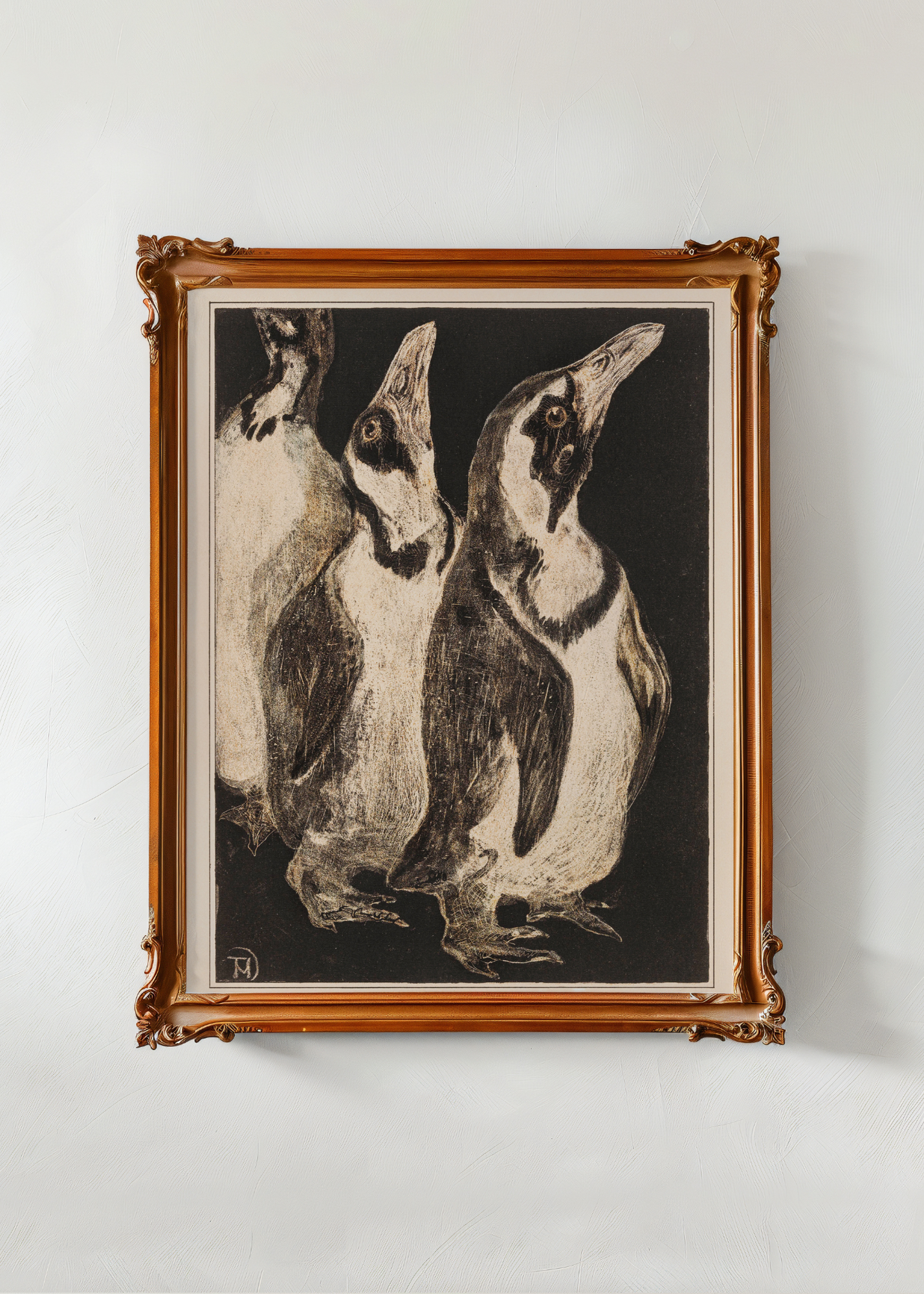 Three Penguins— Theo van Hoytema captures a gentle, wintry charm in Three Penguins, where these endearing figures stand close as if sharing warmth against the cold. Their rounded forms and softly rendered feathers give them a quiet elegance, each one slightly turned in posture, suggesting a subtle story told in glances and tilts. The background is sparse, allowing the focus to rest entirely on the companionship between them. There is something comforting in their stillness, something almost meditative. Van Hoytema, with his characteristic tenderness, presents not just birds, but a portrait of quiet togetherness, of soft endurance, and the sweet, wordless bonds found in shared silence.