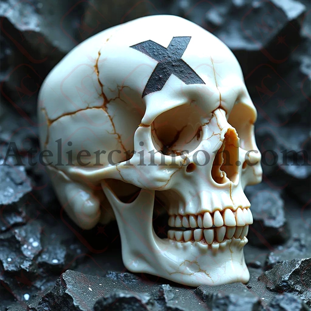 The letter X skull obsidian marble deeply engraved character on the forehead of a white marble skull. The character, filled with dark obsidian, contrasts sharply against the pale skull. Set against a black crystalline background, the skull and character dominate the image.