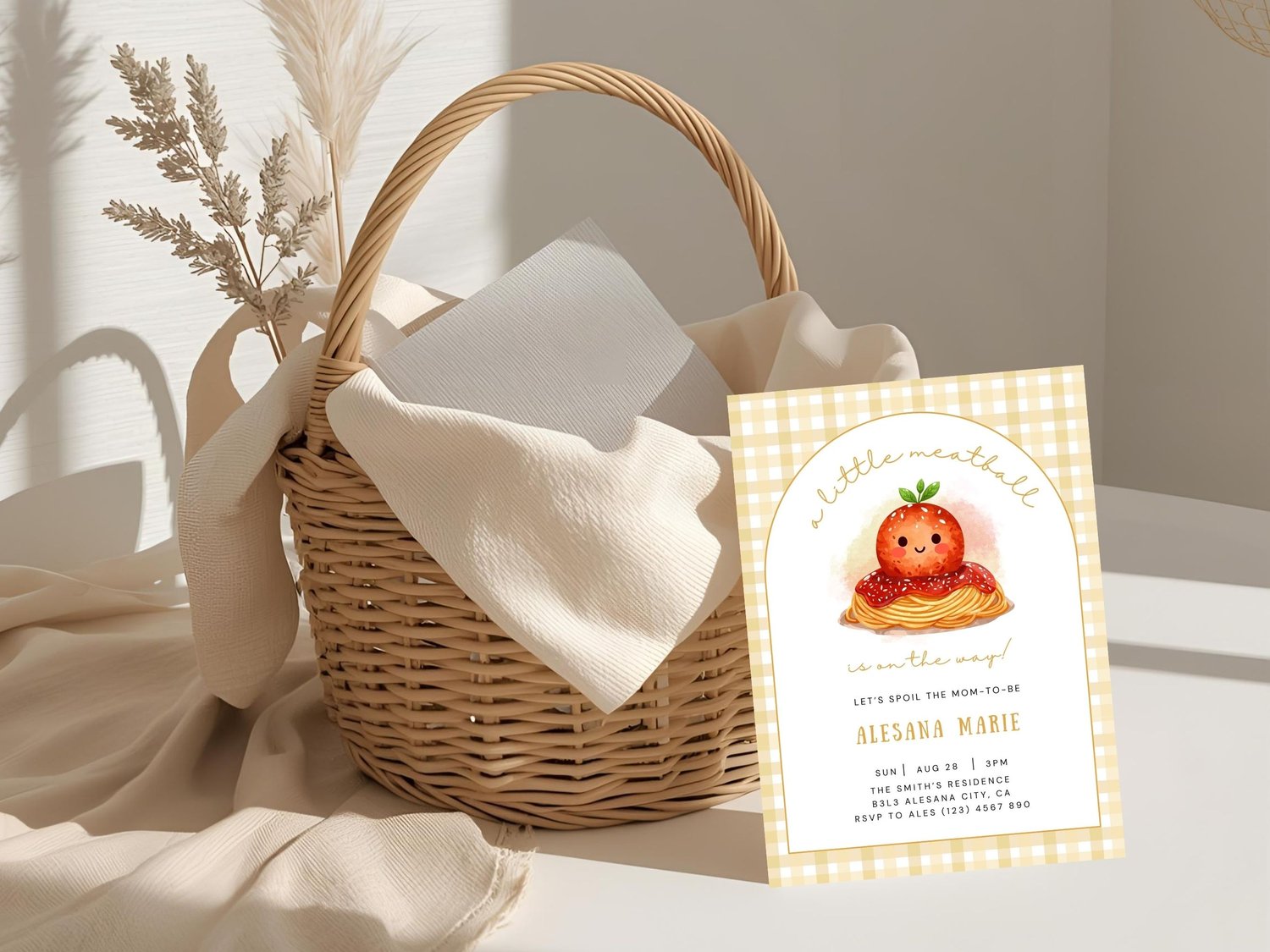 Gingham Meatball Baby Shower Invitation Template | Editable A little Meatball is on the Way Spaghetti Baby Shower Invite Digital Download