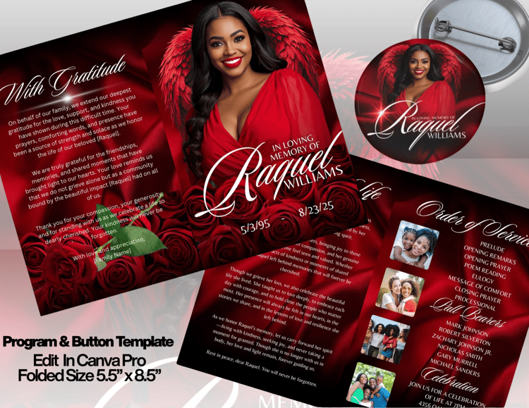 Easily personalize in Canva Pro by adding photos, names, dates, obituary text, poems, or personal tributes. Once customized, simply download as a print-ready PDF and print at home or through a professional print shop.