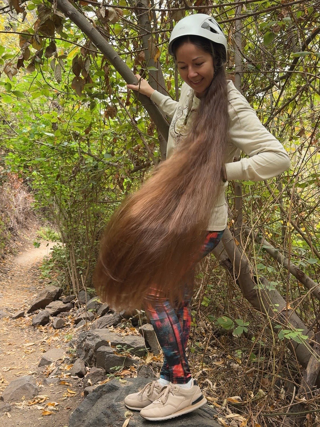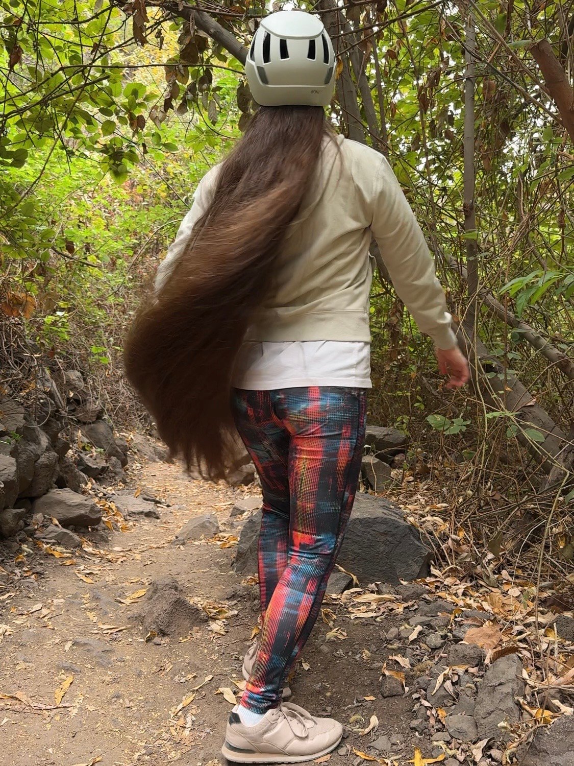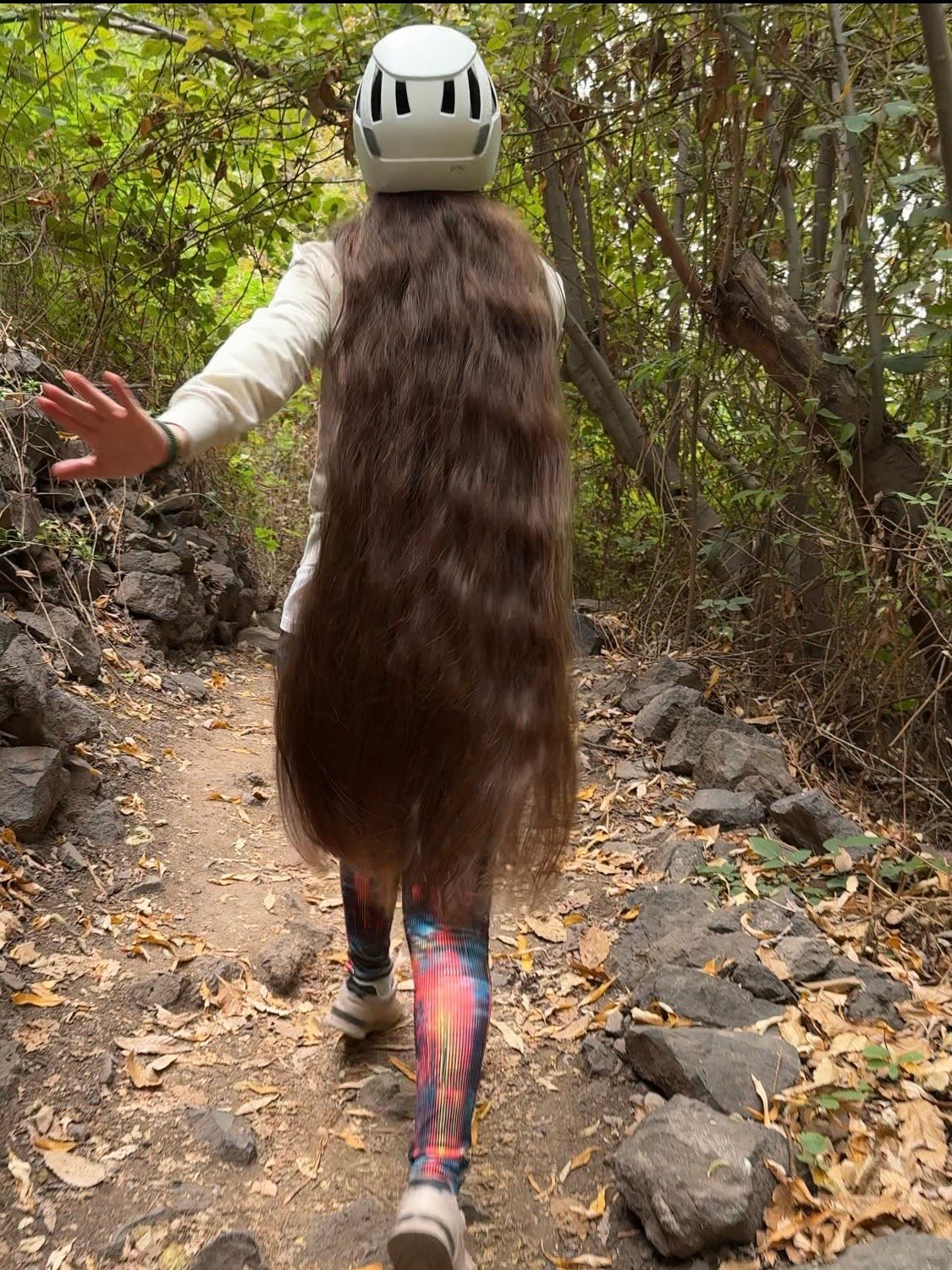 In this video I am walking along a path while wearing a helmet, showcasing my long, loose hair as it moves naturally during the hike.