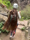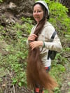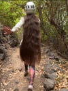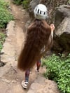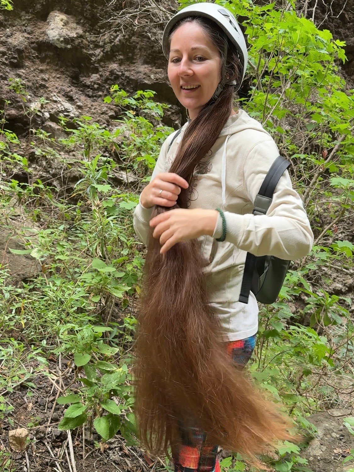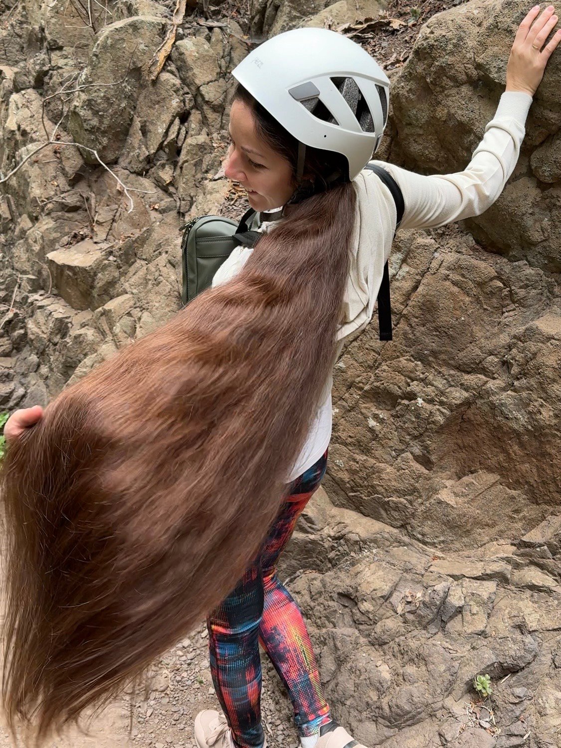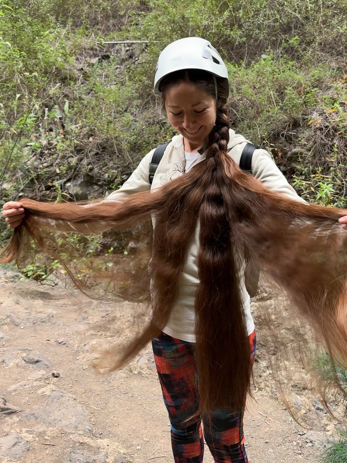 In this video I am walking along a path while wearing a helmet, showcasing my long, loose hair as it moves naturally during the hike.