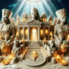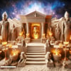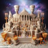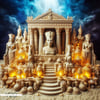 In a digital artwork, a majestic castle stands proudly amidst golden sands, evoking the grandeur of an ancient kingdom. Statues of Nefertiti, intricately detailed, line the pathways leading to the castle, symbolizing regal elegance and timeless beauty. The scene is bathed in a warm, golden glow, capturing the essence of a legendary empire.