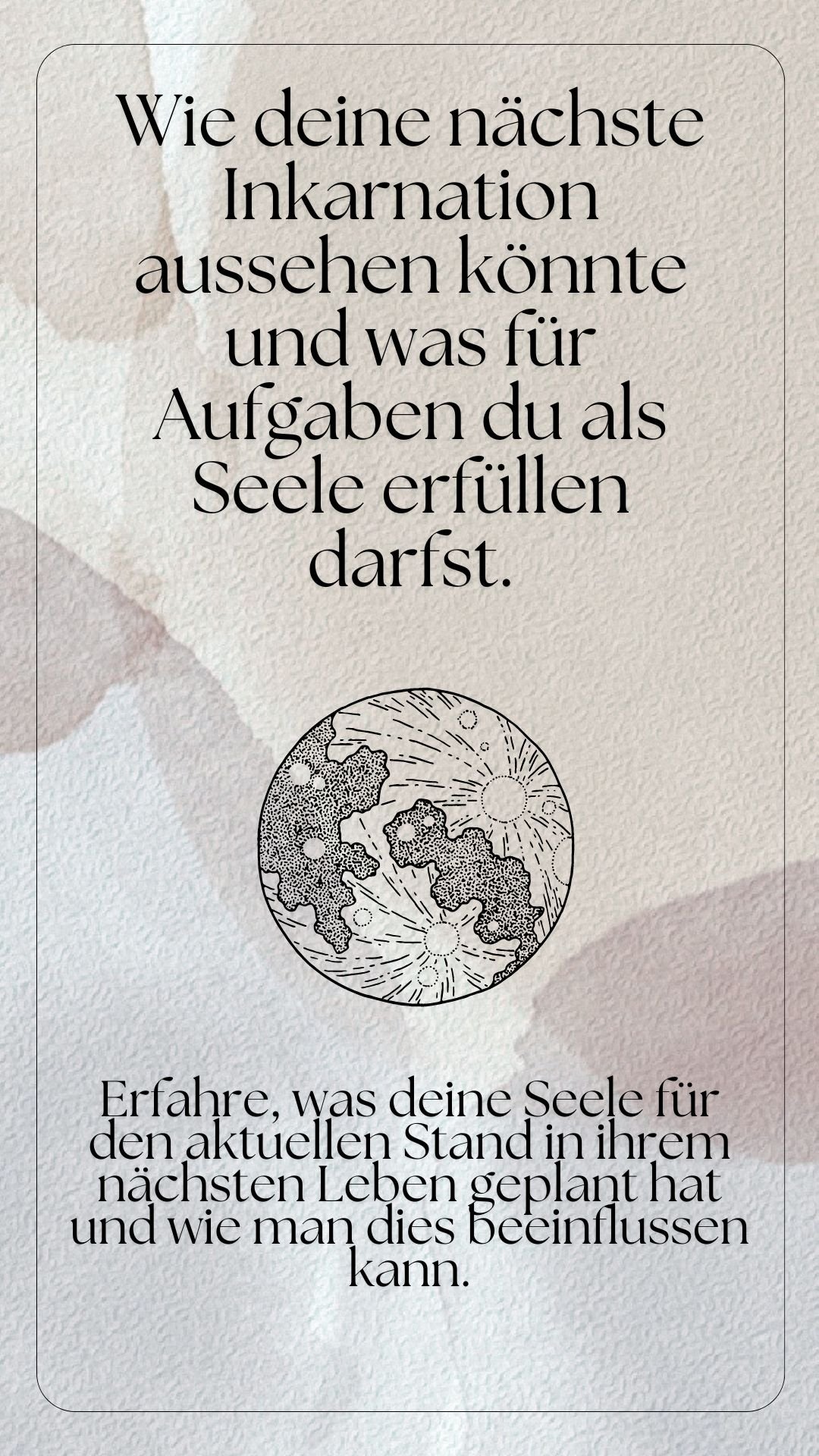 Anschließend kann ich dir Dinge nennen, die sich deine Seele für die nächste Inkarnation festgesetzt hat und welche Aufgaben und eventuelle Fehler zur Aufarbeitung anstehen. Wichtig zu wissen ist, dass dieser Termin nur den aktuellen Stand beleuchtet. Wenn du verschiedene Entscheidungen in der Zukunft triffst, kannst du diese Planung immer wieder verändern.
