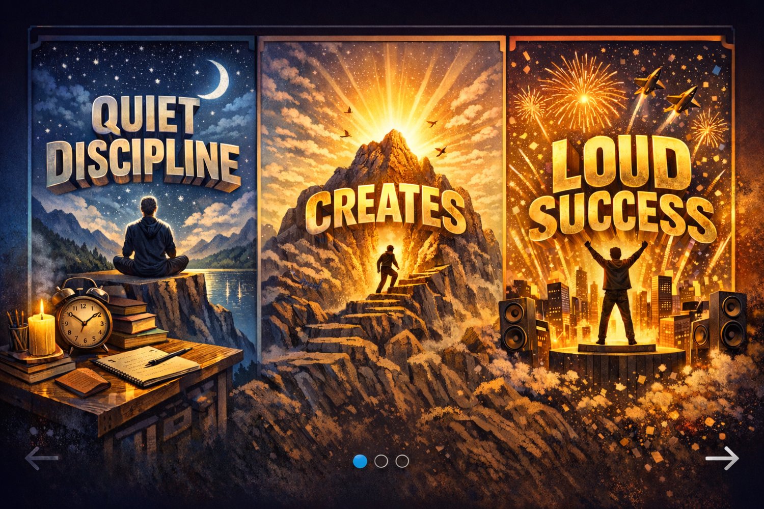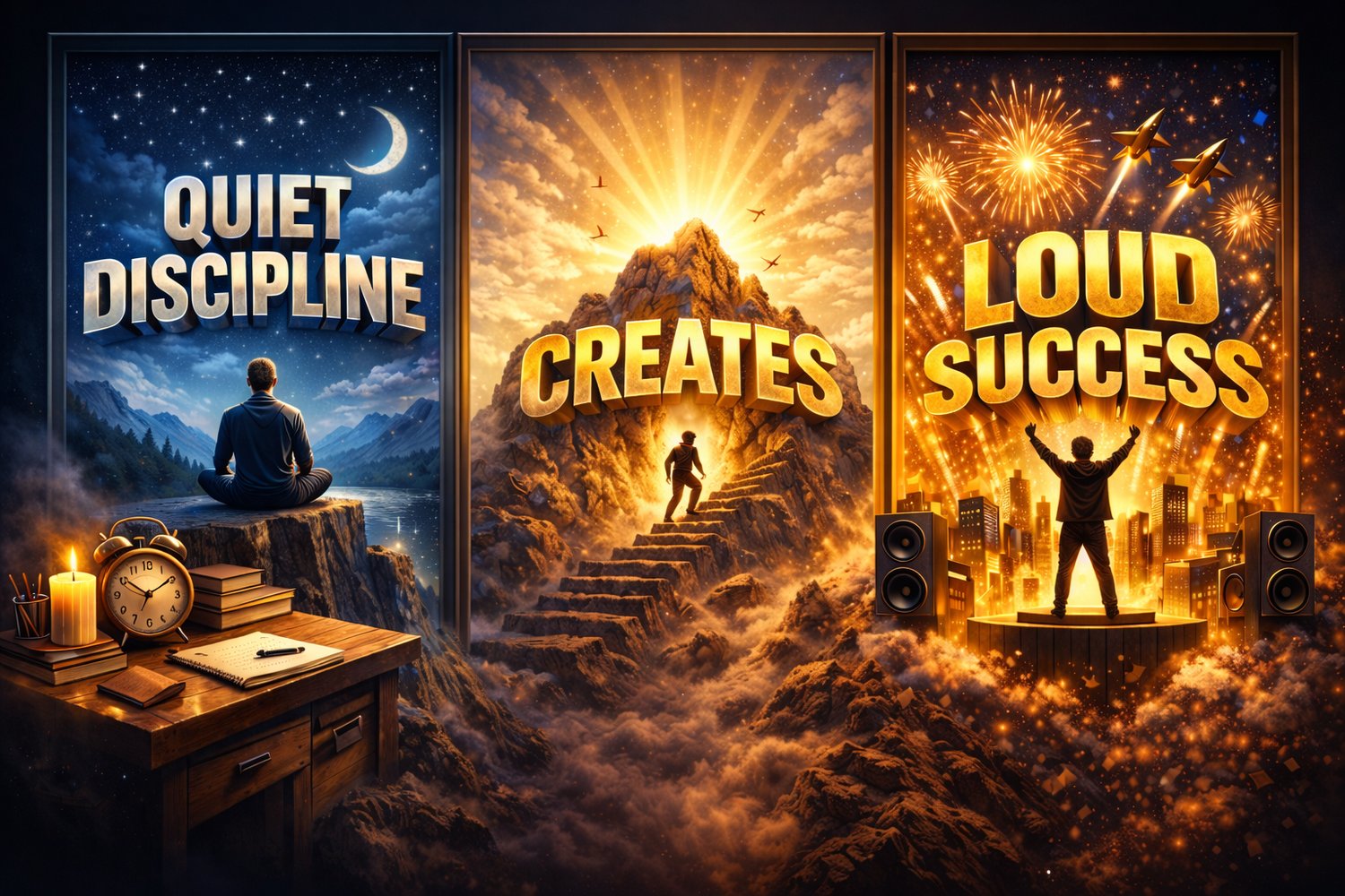 The piece communicates a luxury-motivational philosophy "Quiet discipline creates loud success." Message: Public success is the loud result of quiet work.
