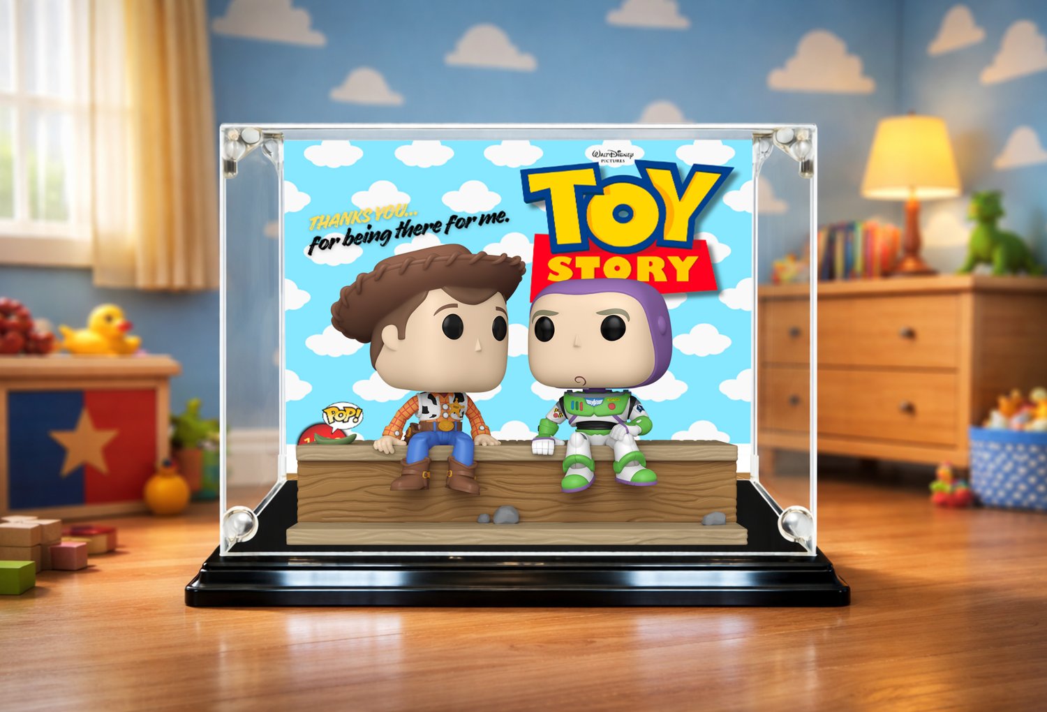 TOY STORY – Display Poster Compatible with Funko Pop! Movie Moments #1599 Woody and Buzz (25x20 cm)