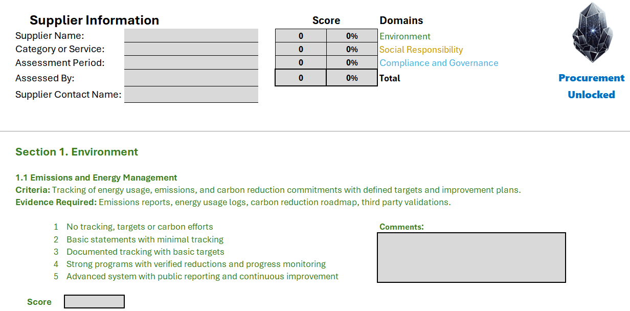 This toolkit follows the Procurement Unlocked approach of structure, clarity and practical application. You can use it internally or send it directly to suppliers to complete with supporting evidence.