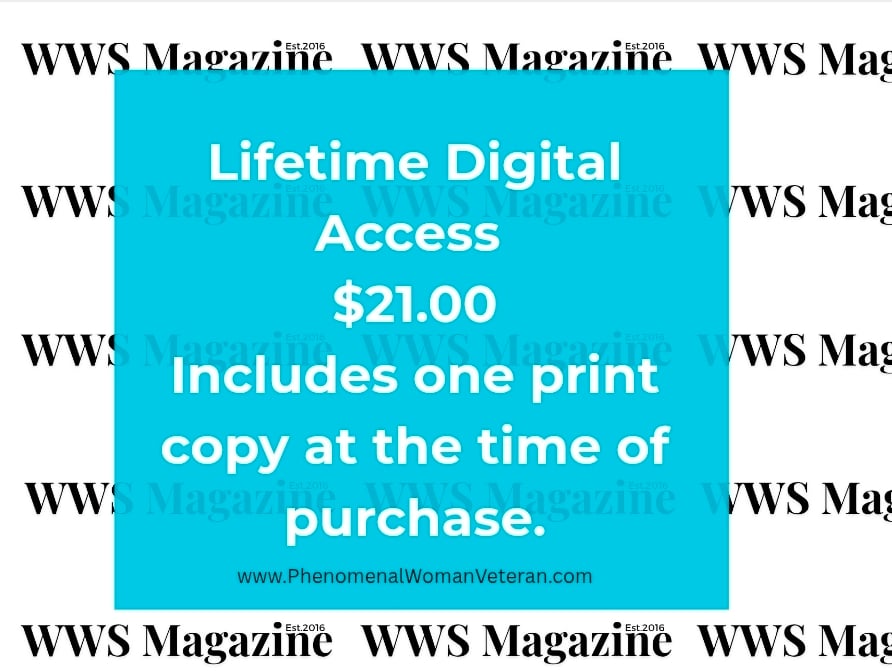 With this purchase you'll receive Lifetime Digital Access to the WomenWhoServed Magazine. This purchase includes one Complimentary Print copy. (One with this purchase only) Quarterly you'll receive an email regarding the release of the new Magazine Issue. Digital Access will be automatically Granted. Once old Issues are available you'll have access to those as well.