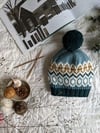 This pattern is adaptable to various skill levels (modifications for the cast on and the colorwork are noted below) and the bold pattern showcases rich colors and yarns with crisp textures. Hat is knit from the bottom up and increases are worked after ribbing before beginning the colorwork. Symmetrical decreases make up the crown.