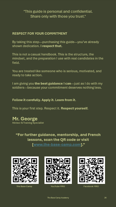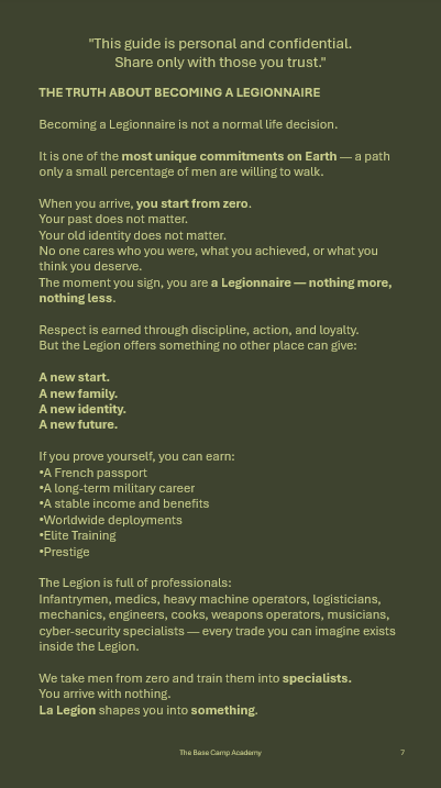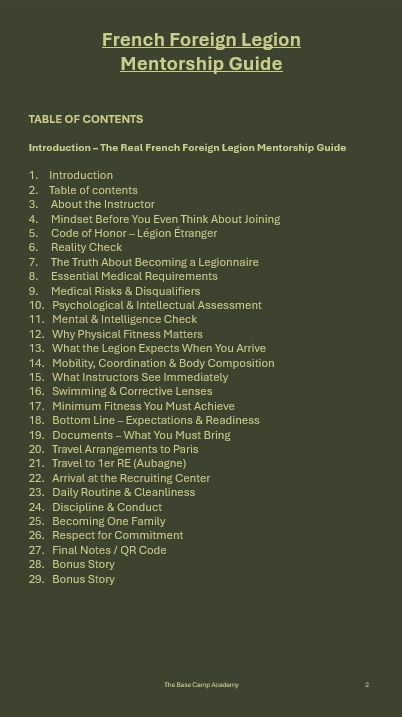 “Get ready for the French Foreign Legion with insider knowledge from a veteran Legionnaire. This 29-page guide covers physical preparation, mental conditioning, recruitment tips, essential how too, and clear guidance to start your journey with confidence. Your mission-ready blueprint starts here.”