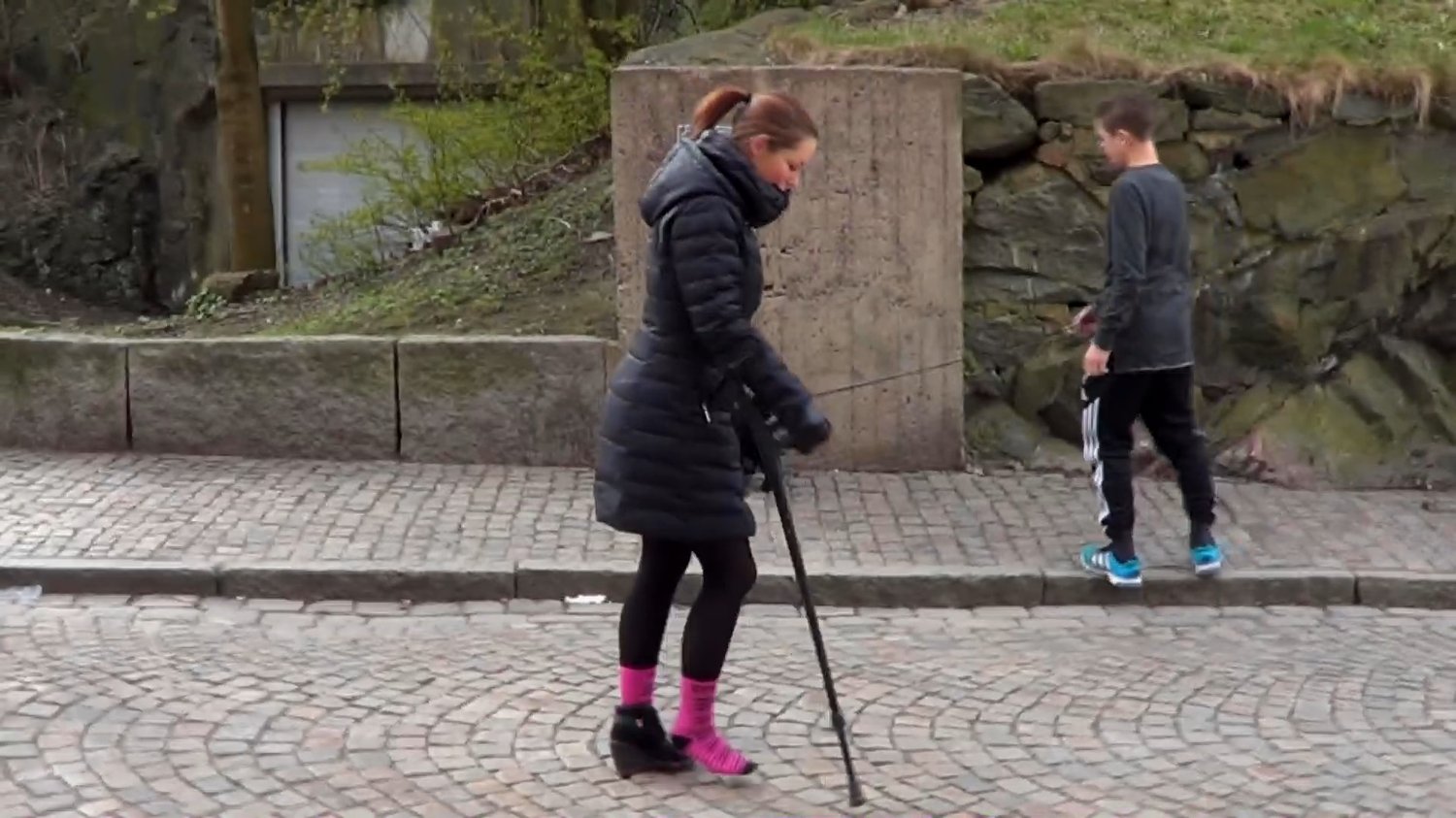 This clip starts with a closeup of Melindas both feet in black pantyhose before she put on some pink and black socks and a shoe on her left foot.Her right foot is still to swollen to get a shoe on but she canwalk carefully on it even if it takes longer time which makes Melinda sometimes crutch nwb as it goes faster.