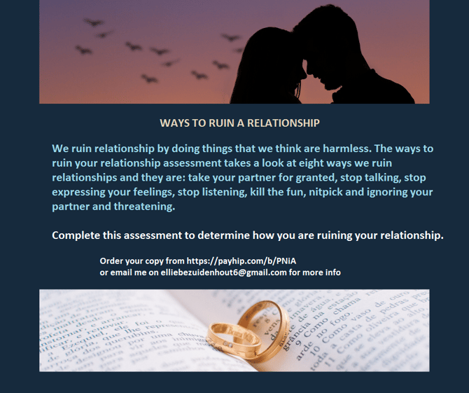 We ruin relationship by doing things that we think are harmless. The ways to ruin your relationship assessment takes a look at eight ways we ruin relationships and they are: take your partner for granted, stop talking, stop expressing your feelings, stop listening, kill the fun, nitpick and ignoring your partner and threatening.