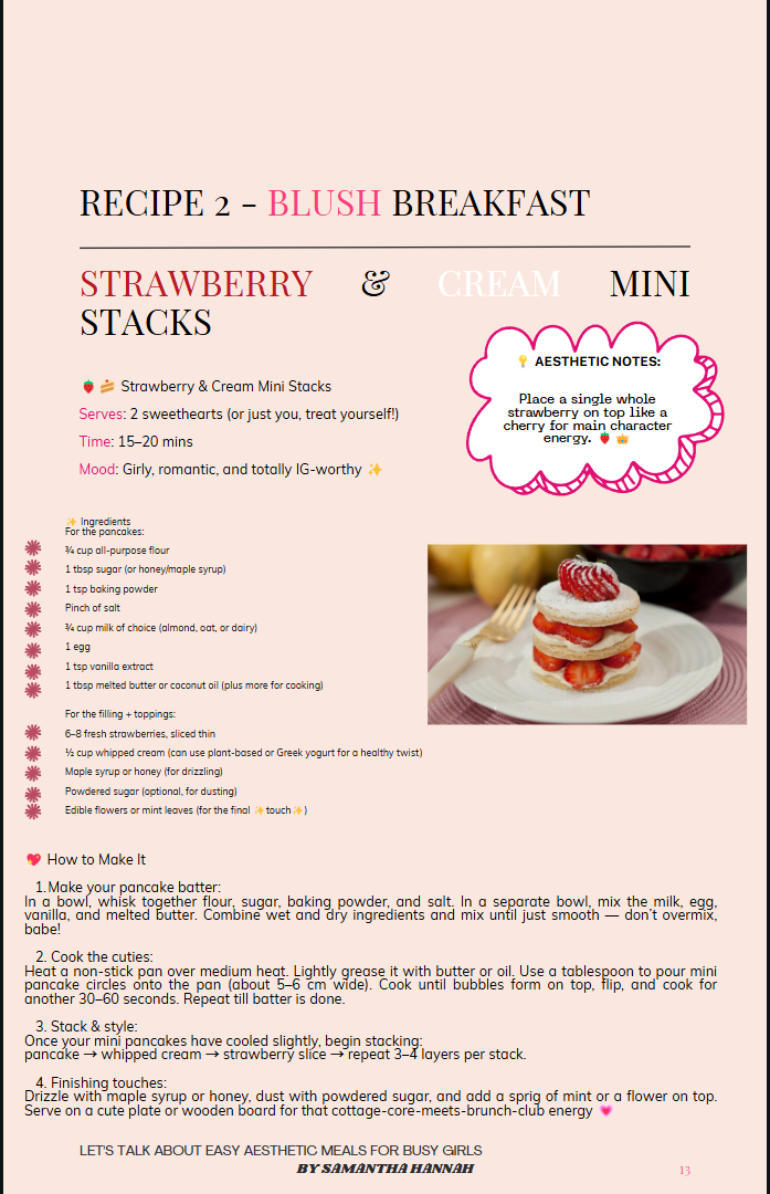 This eBook is made for the modern busy girl who wants to eat cute, feel cute, and still have time to slay the day. A beautiful list of pantry item is also created and found in the ebook. Whether you're cooking for yourself, your feed, or your fave people, these recipes are simple, stunning, and stress-free.