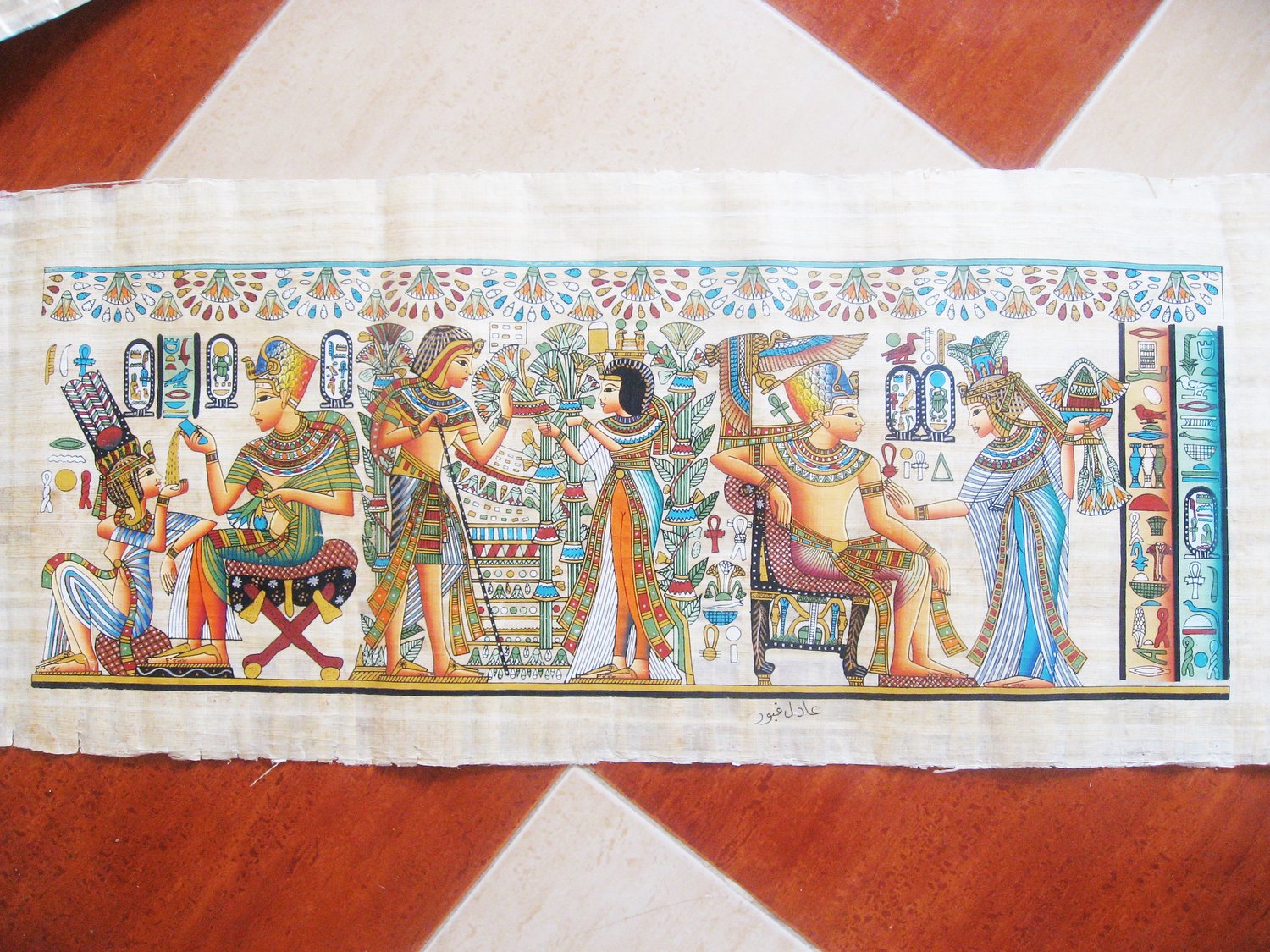 Pharaonic papyrus, King Tutankhamun presents his wife with perfume (100-40 cm)