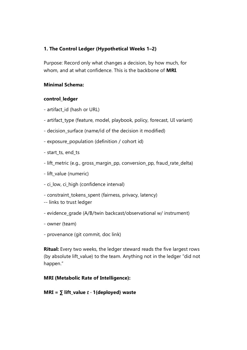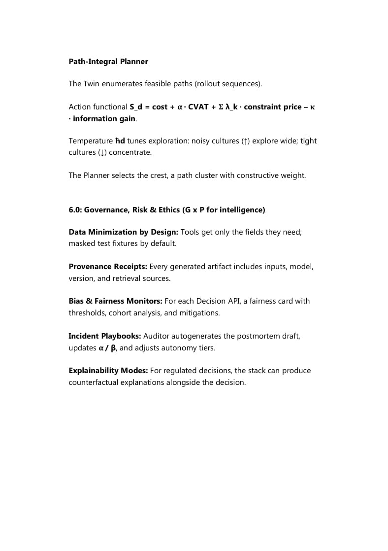 You’ll learn to measure intelligence with MRI (assimilated signal vs. waste), tax hidden fragility with CVAT (Complexity VAT), trade permission on a Constraint Exchange, and choose rollouts via a Path Integral of Strategy that prices cost, complexity, compliance, and information gain—at a cultural “temperature” that you set. An AI Autopilot of specialized agents (Metabolist, Treasurer, Strategist, Auditor, and more) runs Decision APIs, drafts code and memos, simulates consequences in the Twin, and posts receipts to ledgers so learning compounds.