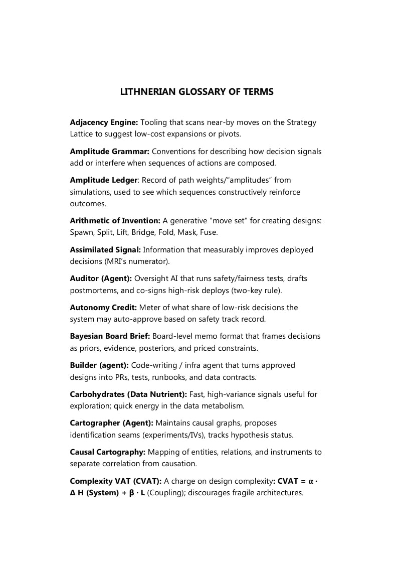 Refusing the splits between data, strategy, and software, Lithner designs an organization as a living mind: metabolism for signal, ledgers for memory and incentives, a lattice for attention, a twin for consequence, a planner for choice, and an arithmetic for invention. The result is a complete operating system for converting perception into advantage under constraint.