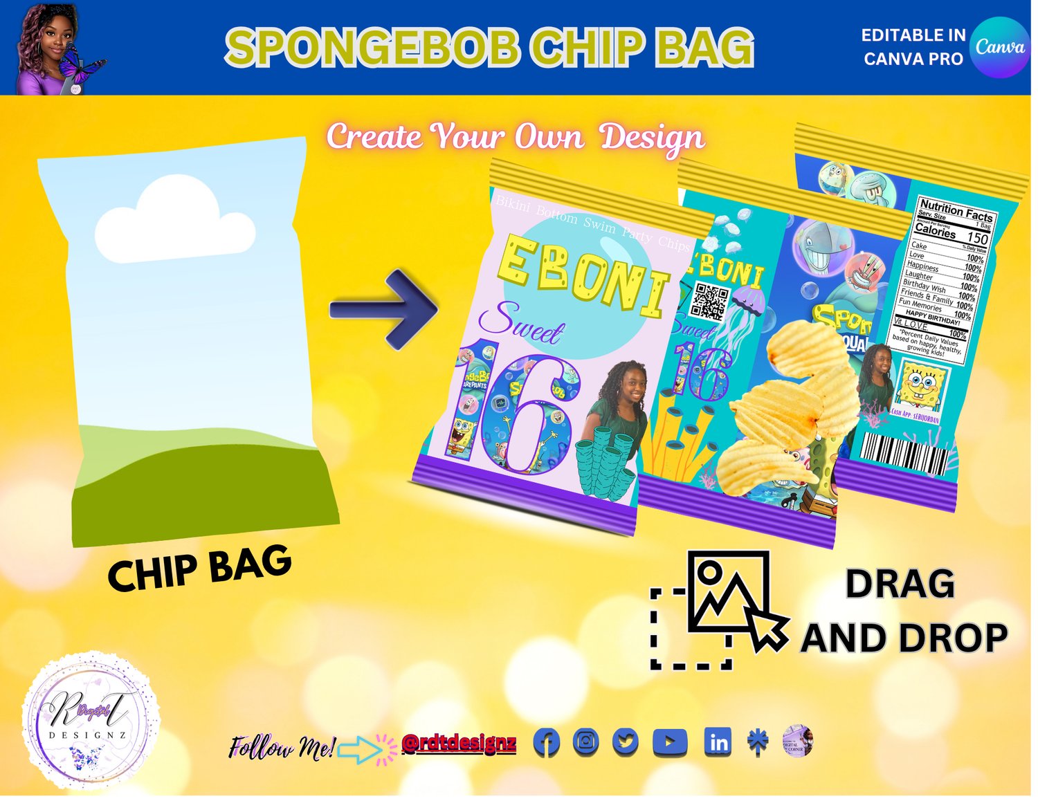 Add a splash of fun and color to your party favors with our vibrant "SpongeBob" chip bag template. Perfect for ocean-themed parties, birthday celebrations, or SpongeBob fans of all ages, this customizable design features cheerful characters and bright, eye-catching graphics. Easy to personalize with your own message or event details, it’s a fantastic way to serve snacks that are as fun as the party itself. Dive into creativity with RdT Designz and make your event unforgettable!