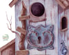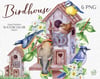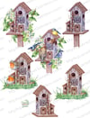 Pretty cute birdhouses. Robin bird, tit, nuthutch. Flowers and plants. Compositions in rustic style