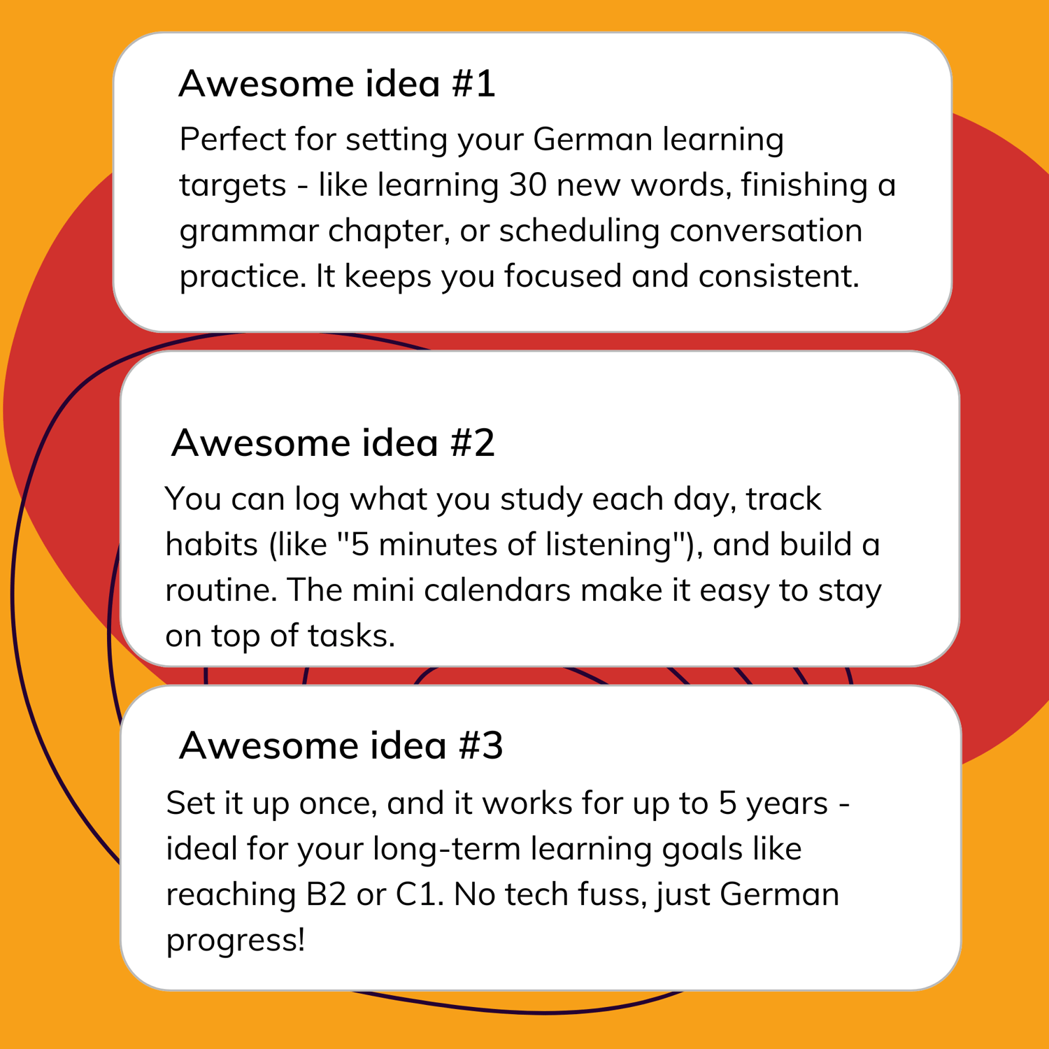 Stay organised and motivated in your German learning journey with this reusable yearly calendar designed especially for German learners!