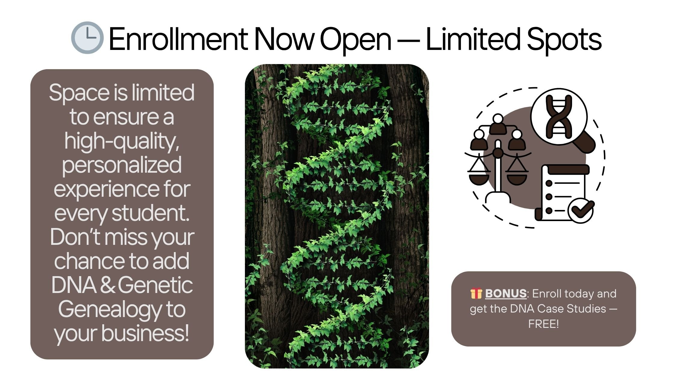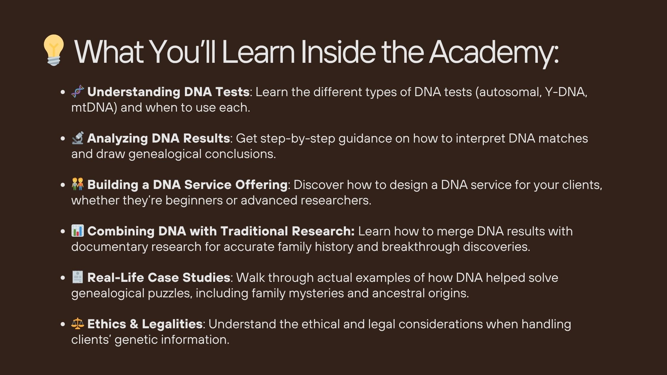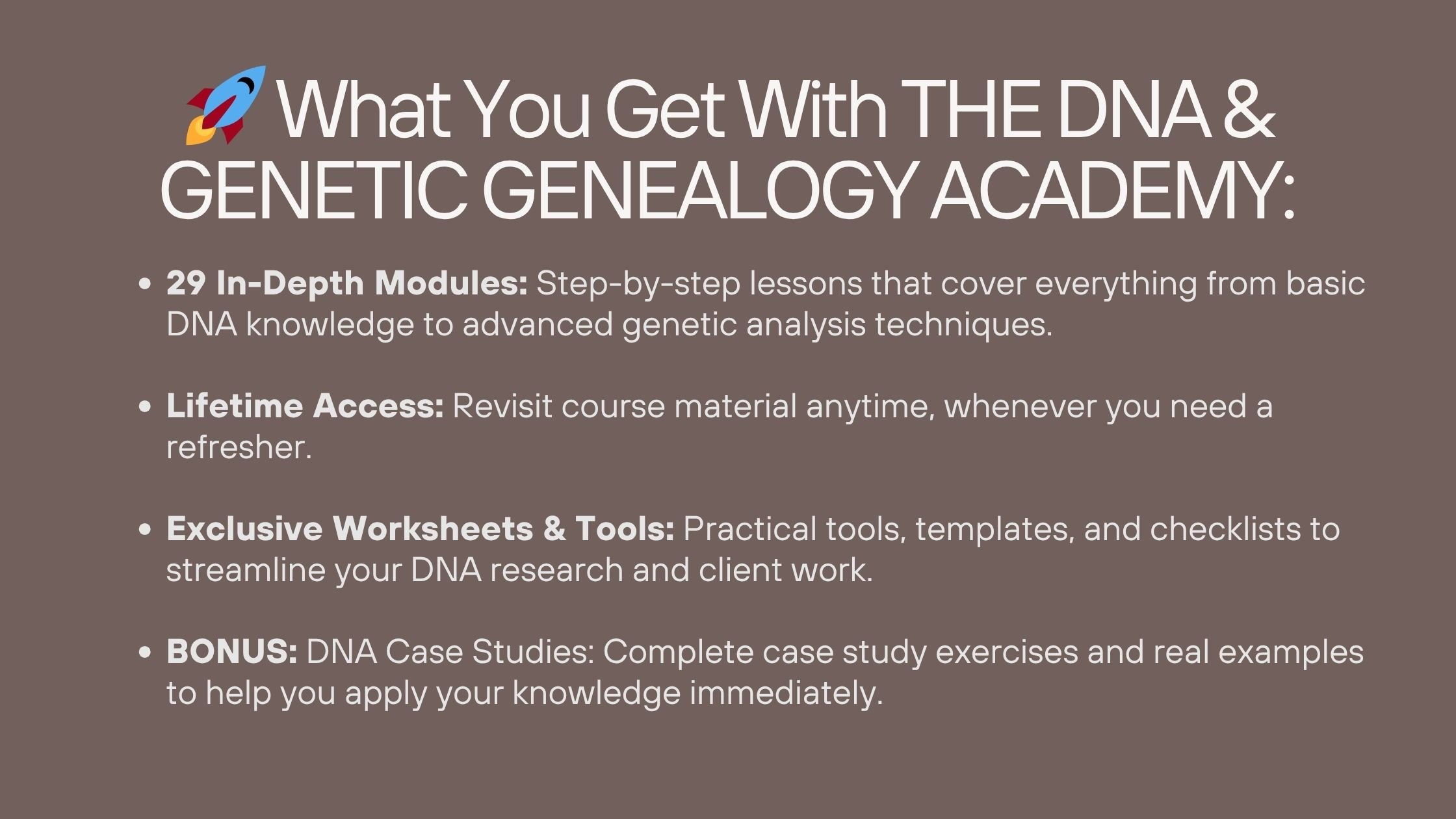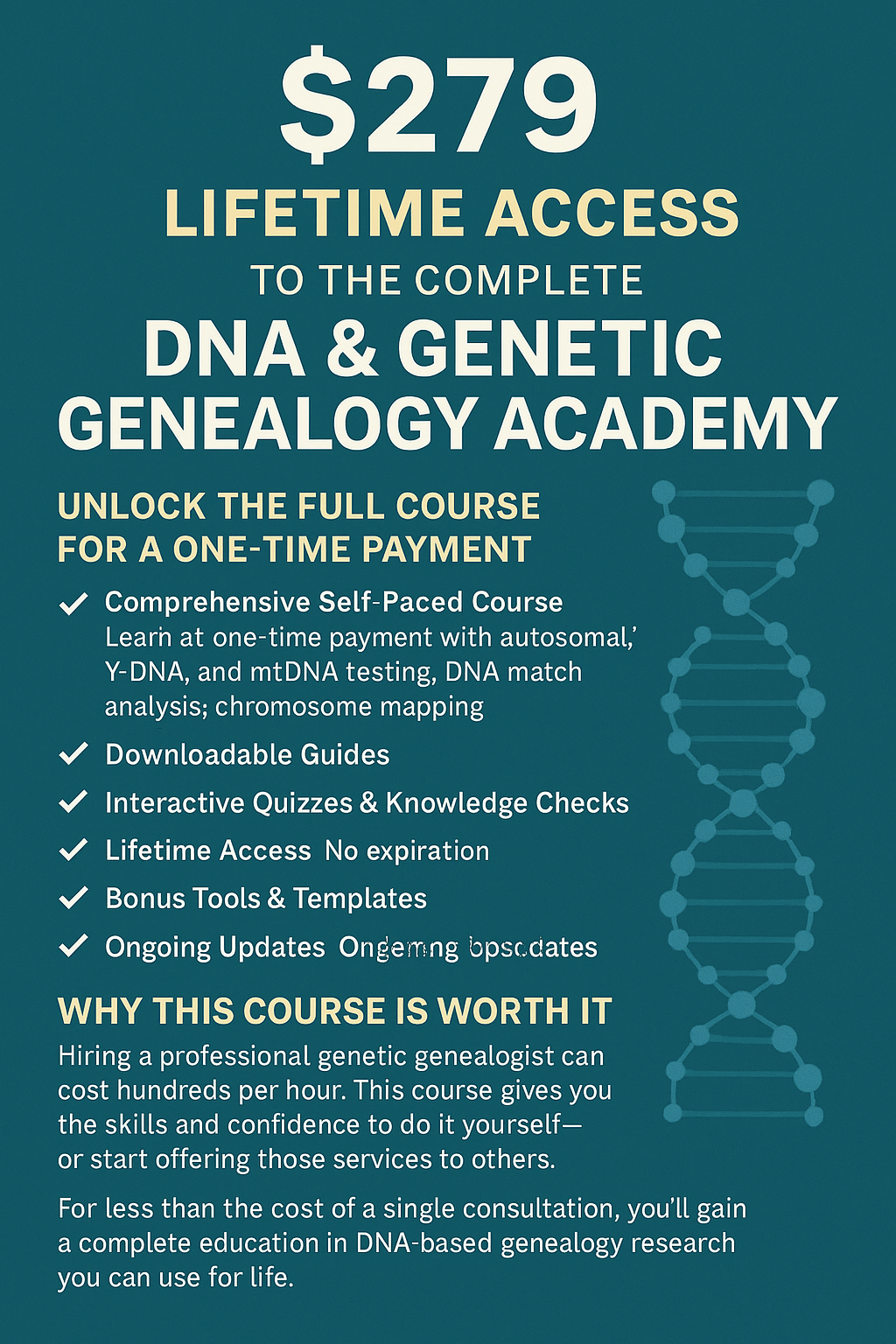 Turn your DNA results into powerful family history discoveries. For a single payment of $279, you’ll unlock lifetime access to the complete DNA & Genetic Genealogy Academy—your all-in-one roadmap to mastering genetic genealogy.