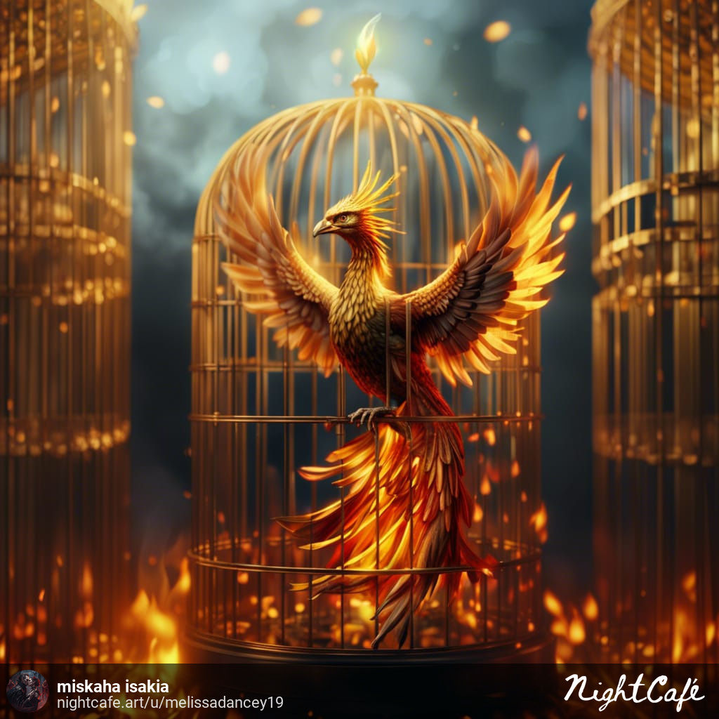 Small phoenix in a golden cage rising from fire- wallpaper- ai art generator