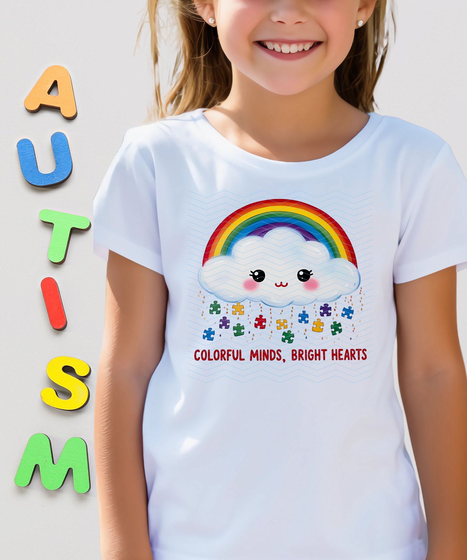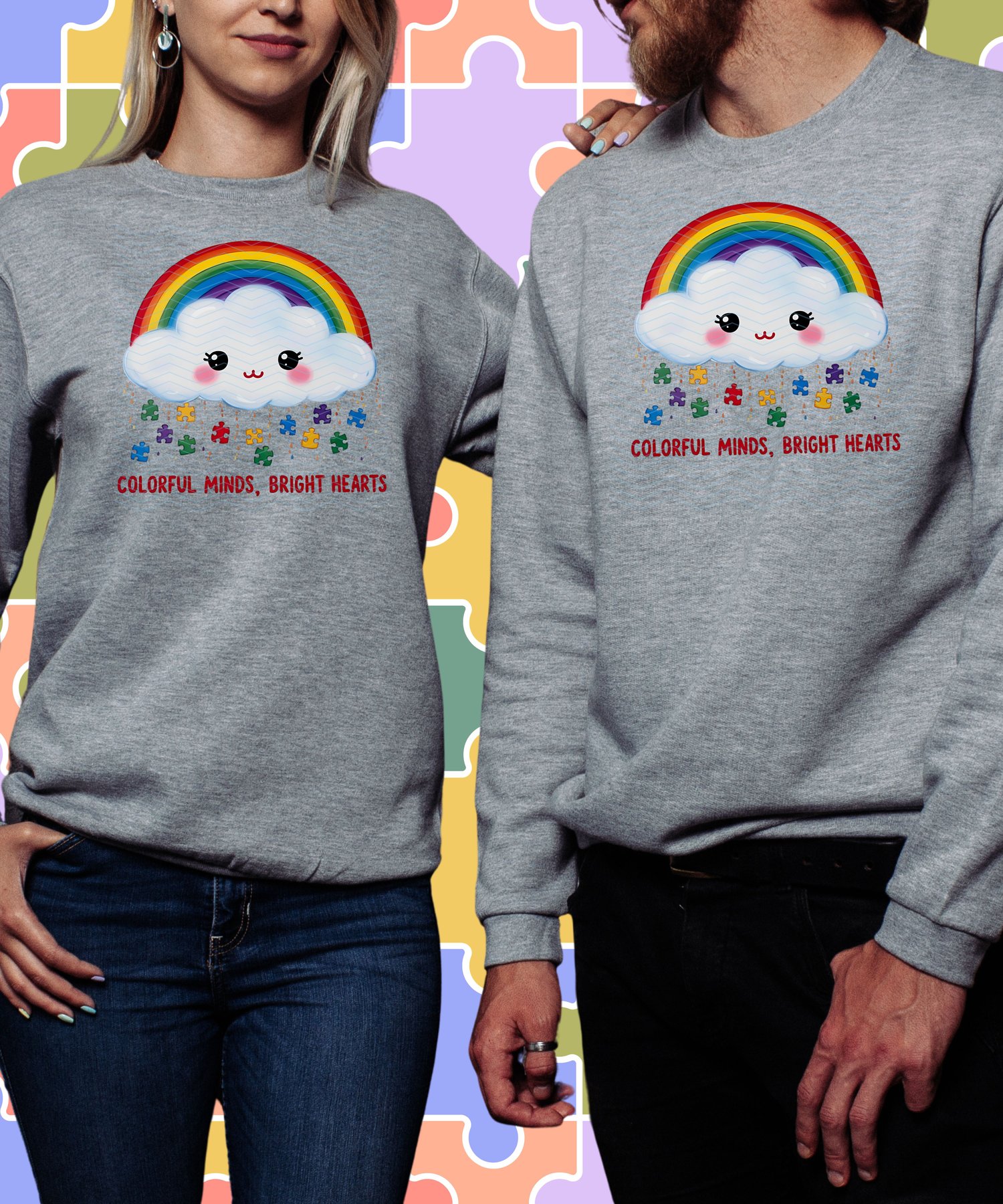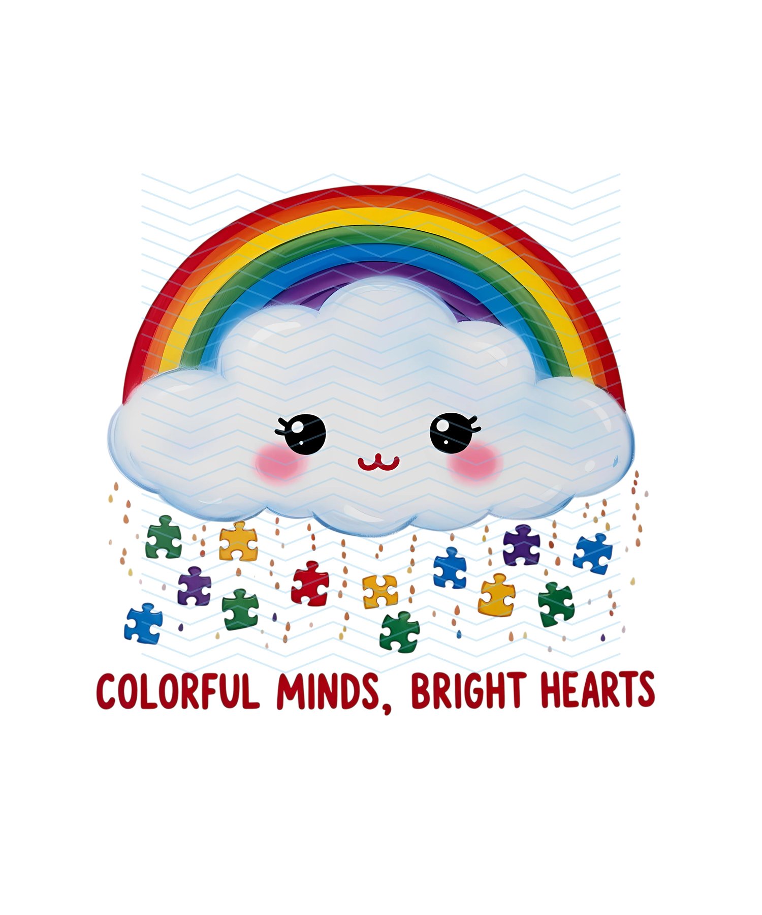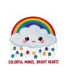 This adorable rainbow cloud showers puzzle pieces to symbolize the vibrant and creative minds within the autism community. With a cute and cheerful expression, this design is perfect for spreading love, joy, and awareness.