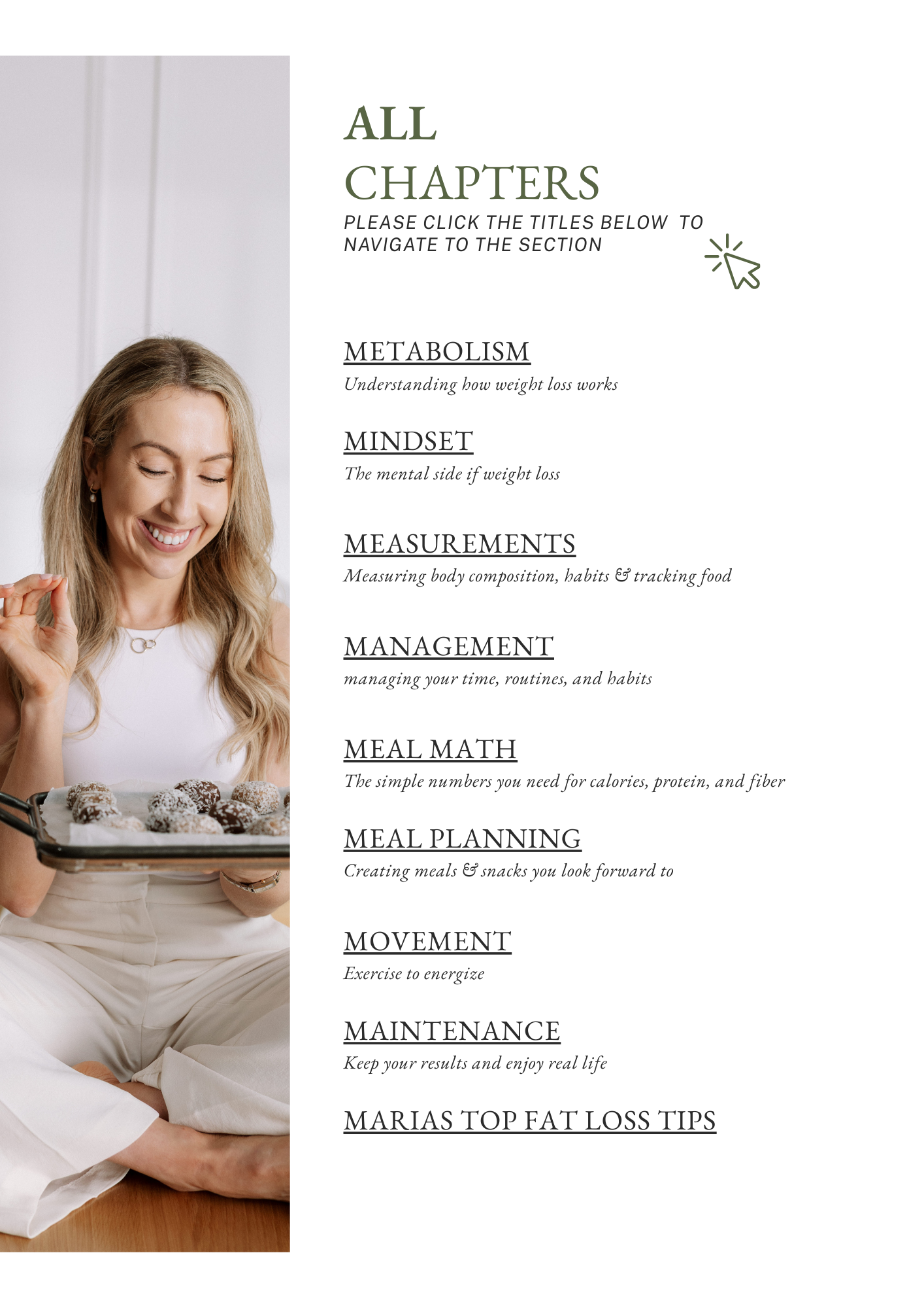 - The exact amount of protein, carbs, fat and fiber you need for sustainable fat loss (with practical food lists that make hitting your targets easy).