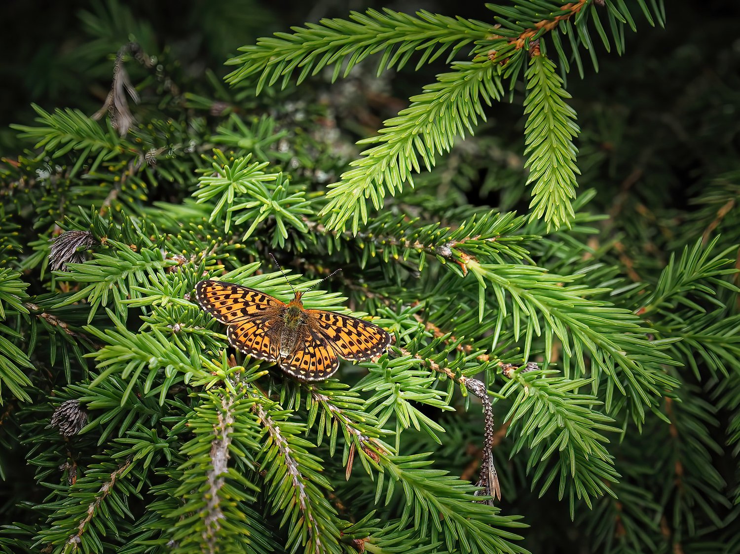 A beautiful butterfly has landed on the branch of a small fir tree.